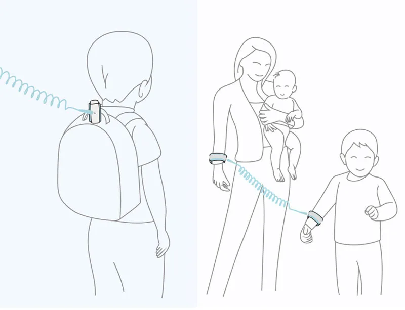 Конец родителя можно прикрепить к рукам родителей, рюкзаку, поясу, тележке, корзине для покупок, освободить руки в любое время