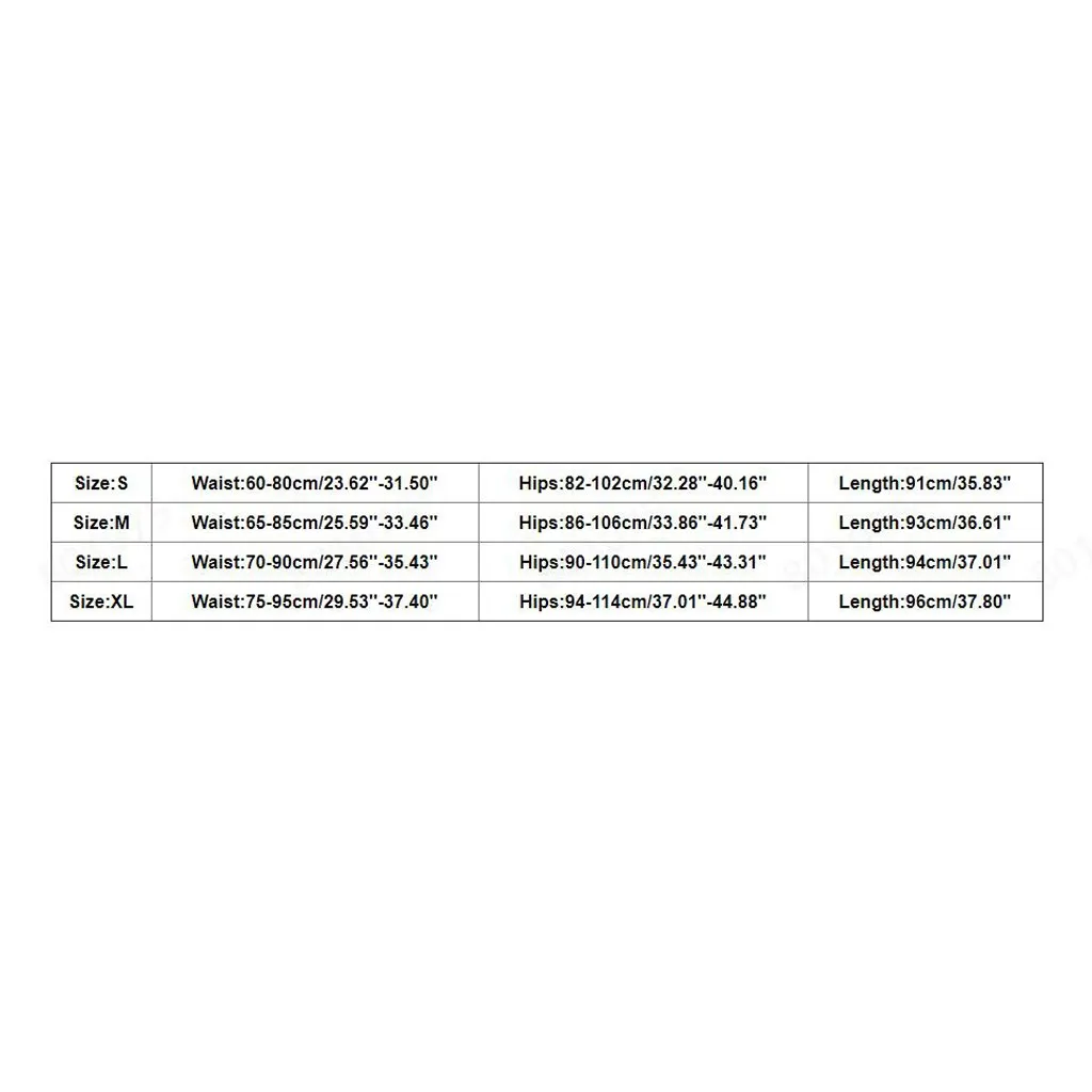 Size Waist Hips Length S 60-80cm/23.62''-31.50'' 82-102cm/32.28''-40.16'' 91cm/35.83'' M 65-85cm/25.59''-33.46'' 86-106cm/33.86''-41.73'' 93cm/36.61'' L 70-90cm/27.56''-35.43'' 90-110cm/35.43''-43.31'' 94cm/37.01'' XL 75-95cm/29.53''-37.40'' 94-114cm/37.01''-44.88'' 96cm/37.80''