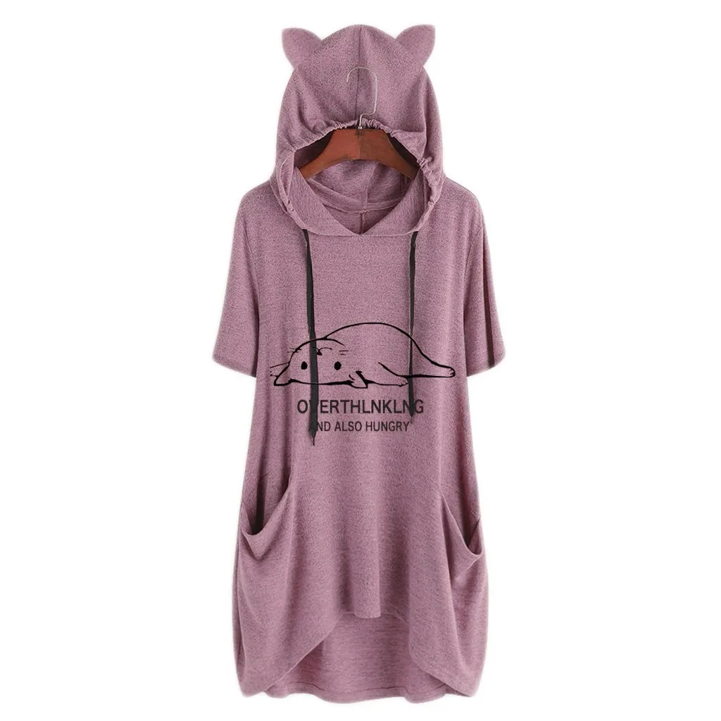Топ с капюшоном и короткими рукавами с принтом кошачьих ушек и карманами. Лучше всего сочетается с шортами, юбками, джинсами и леггинсами.
