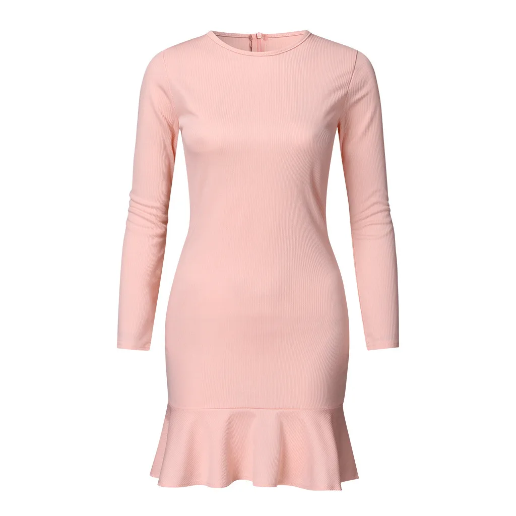 Женское модное однотонное платье с круглым вырезом и оборками с длинным рукавом, повседневное Формальное сексуальное платье