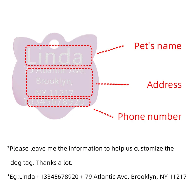 Самое главное: * Пожалуйста, оставьте мне информацию, чтобы помочь нам настроить ярлык собаки. Большое спасибо. * Например: Allen + 13345678920 + 79 Atlantic Ave. Brooklyn, NY 11217 Технические характеристики: * Материал: Алюминий * Размер: как показано на картинке * Толщина: около 9 мм * Вес: около 2 г * Количество: 2 шт. * Особенности: индивидуальная, индивидуальная, Бесплатная лазерная печать, красочная. Примечание: 1. Размер может быть неточным на 1-2 мм из-за ручного измерения. 2. Цвет может немного отличаться из-за монитора, спасибо за понимание. 3. Мы осуществляем оптовую и прямую поставку, если вам нужно больше, пожалуйста, свяжитесь с нами. Мы предоставим вам скидку. Спасибо! 4. Если у вас есть какие-либо вопросы, пожалуйста, свяжитесь с нами. С нетерпением ждем вашей покупки.