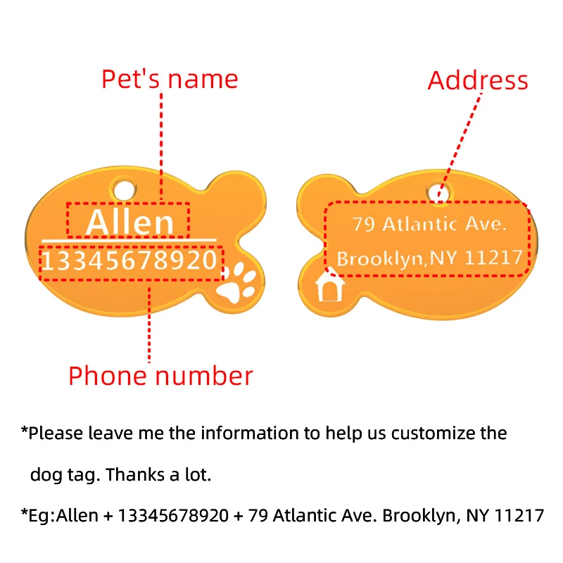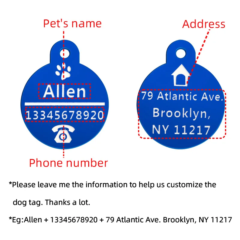 Самое главное: * Пожалуйста, оставьте мне информацию, чтобы помочь нам настроить ярлык собаки. Большое спасибо. * Например: Allen + 13345678920 + 79 Atlantic Ave. Brooklyn, NY 11217 Технические характеристики: * Материал: Алюминий * Размер: как показано на картинке * Толщина: около 9 мм * Вес: около 2,5 г * Количество: 2 шт. * Особенности: индивидуальная, индивидуальная, Бесплатная лазерная печать, красочная. Примечание: 1. Размер может быть неточным на 1-2 мм из-за ручного измерения. 2. Цвет может немного отличаться из-за монитора, спасибо за понимание. 3. Мы осуществляем оптовую и прямую поставку, если вам нужно больше, пожалуйста, свяжитесь с нами. Мы предоставим вам скидку. Спасибо! 4. Если у вас есть какие-либо вопросы, пожалуйста, свяжитесь с нами. С нетерпением ждем вашей покупки.