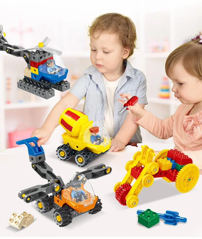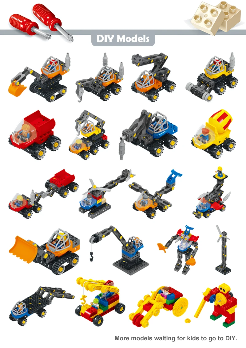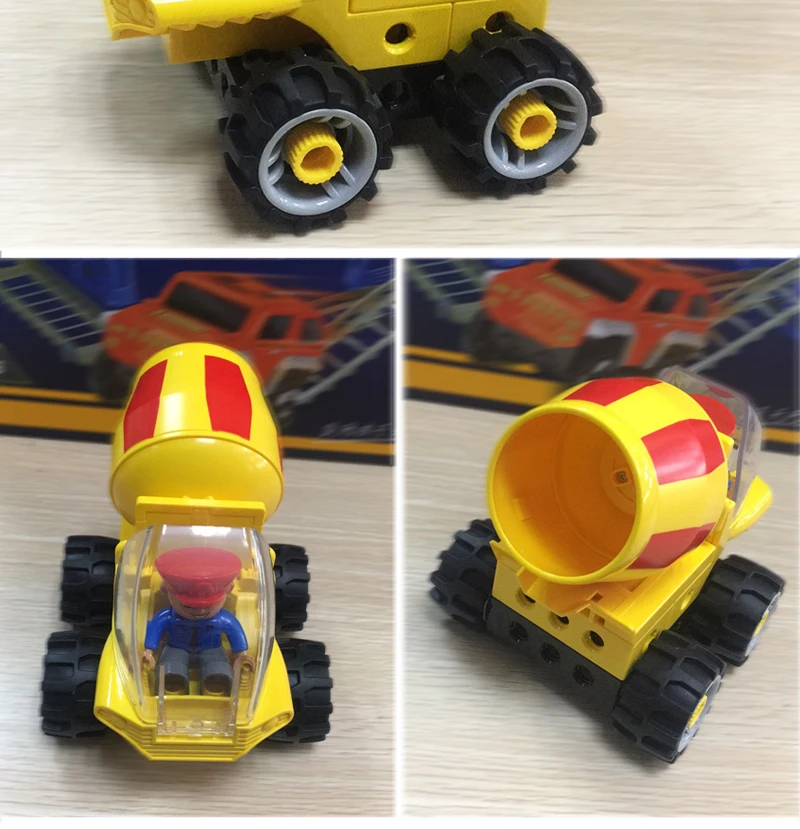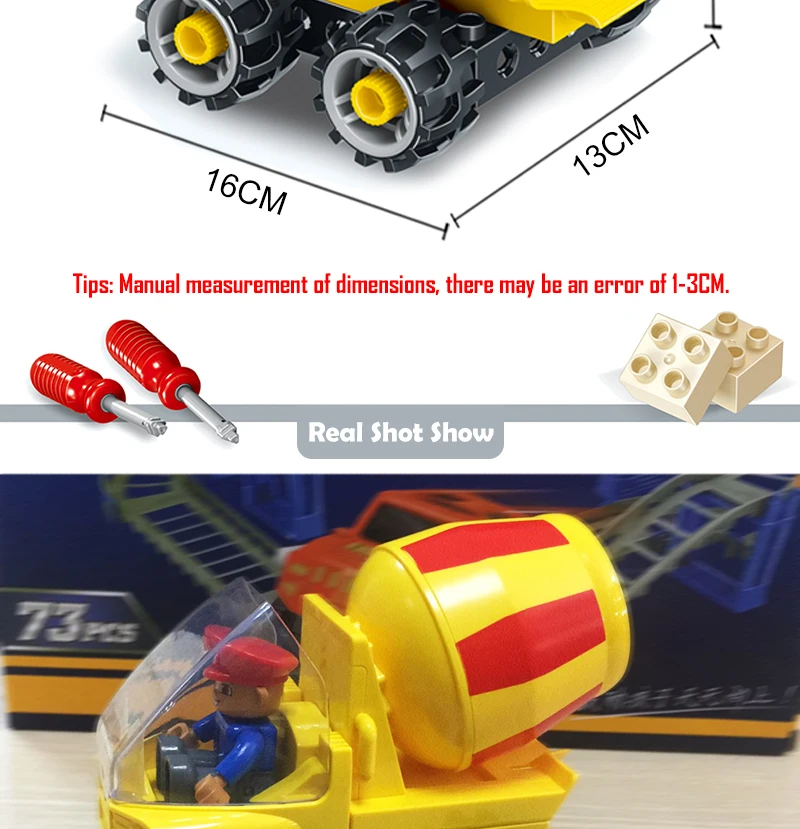 Особенности: строительные блоки большого размера DIY, креативные игрушки, кирпичи с винтами, могут быть прочно соединены вместе, не легко диспергироваться, реалистичная форма, кокпит может сидеть куколкой, ведро для смешивания может вращаться.