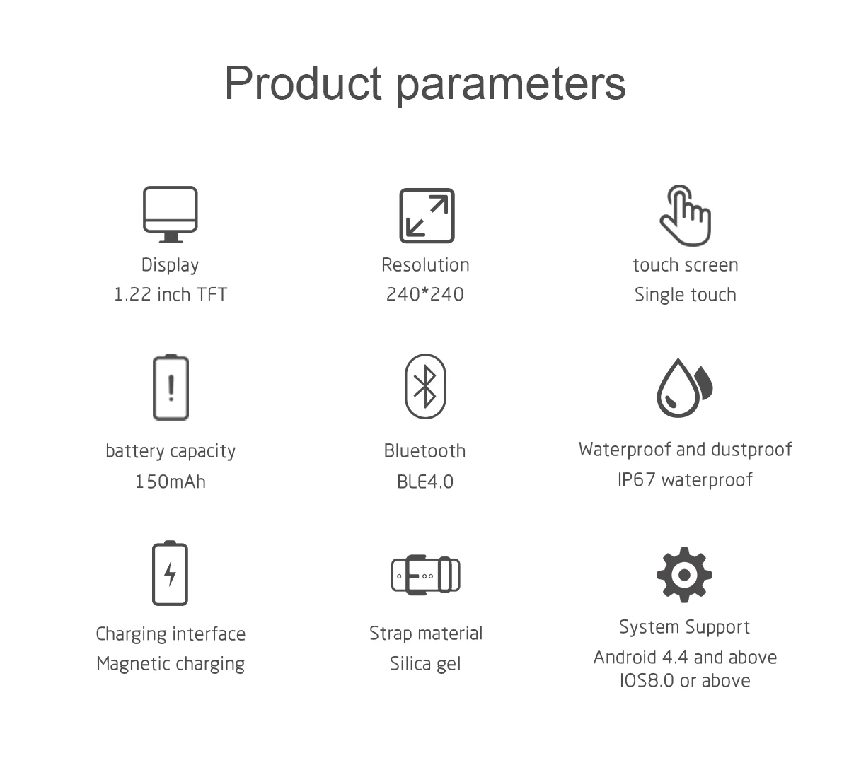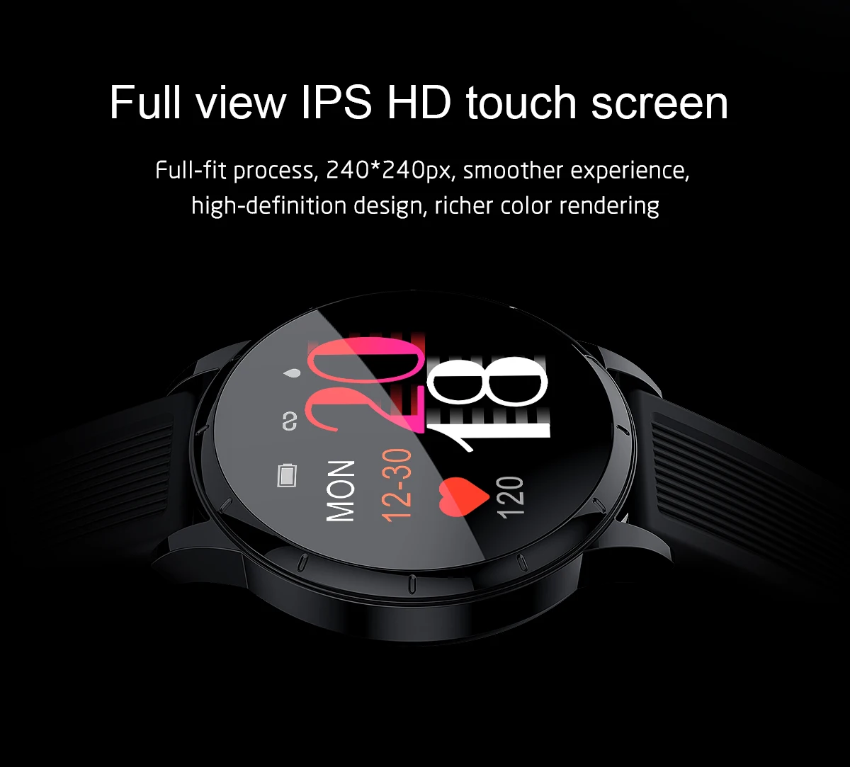 Характеристики: шаг, расстояние упражнений, сожженные калории, пульс, кровяное давление, несколько режимов упражнений, напоминание о сообщениях SNS, Обнаружение сна, поднимите руку, чтобы осветить, напоминание о сидячем положении, умный будильник, поддержка кампании WeChat, доступ для здоровья Apple Смарт-часы с монитором сердечного ритма Крови Давление часы Трекер сна Сигналы напоминания и будильника Управление Romete: дистанционное управление музыкой/удаленное фото Спецификация ЖК-дисплея: разрешение 1,22 дюйма 240*240 Характеристики сенсорного экрана: одно касание IP67 из водонепроницаемого материала Батарея: 150 мА-ч Теоретическое время работы в режиме ожидания: 15 дней Теоретическое рабочее время: 7 дней Язык поддержки приложения: китайский, традиционный китайский, английский, русский, немецкий, итальянский, японский, французский, персидский, испанский, португальский, вьетнамский, корейский