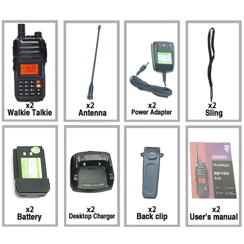 Посылка: -2 x TG-UV2 плюс 10 Вт Радио -2 литий-ионных аккумулятора 4000 мАч -Зарядное устройство-2 шт. -2 зажима для ремня -2 ремешка для рук -Антенна-2 шт. -2 x руководство пользователя на английском языке