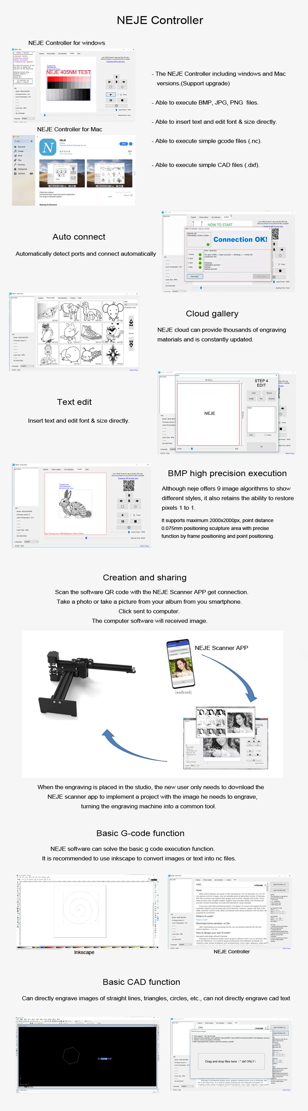 Особенности: Это не набор «сделай сам». После строгой проверки качества вся машина была протестирована и собрана на заводе, вам просто нужно собрать ось X и ось Y вместе, очень легко начать. Поддержка приложения «neje scanner», интеллектуальная коллекция и создание, сканирование фотографий, интеллектуальный алгоритм автоматической печати подключений. Брать a. JPG или. Фото PNG с камеры или альбома и отправьте фотографию непосредственно на программное обеспечение windows и MAC. Встроенная машина с защитным устройством гироскопа. Когда машина работает, встроенный гироскоп будет записывать рабочее положение в начале. Если есть случайное касание или машина смещена, машина автоматически прекратит работу, чтобы предотвратить несчастные случаи. Профессиональный алгоритм обработки файлов, программное обеспечение может восстановить ваш дизайн 1:1 без потерь на каждый пиксель. Различные алгоритмы изображения лучше представляют характеристики изображения вашей семьи или кумира. Установить драйвер и программное обеспечение было очень просто. Загрузите и установите непосредственно по ссылке, программное обеспечение будет автоматически подключено после открытия программного обеспечения. Предоставить профессионалам возможность непосредственно разбирать работы, разработанные по Inkscape и CAD, непосредственно выполнять. Nc файлы и. Dxf файлы и выполнять их точно. Вы можете сделать сложные изменения в PS / Inkscape / CAD или аналогичные и просто сжечь с включенной программой. В то же время, он поддерживает программное обеспечение NEJE control и программное обеспечение GRBL, которое может не только наслаждаться простой портативностью программного обеспечения NEJE,Но также поддерживают работу удовольствие от GRBL программное обеспечение с открытым исходным кодом; Он поддерживает динамического управления лазерный модуль Разработанный Neje, который может поддерживать мощности с ШИМ регулирования, низкий светильник Регулирование яркости, лазерная гравировка машины Индукционная температура защиты. 4A нагрузка по току, что обеспечивает мощный выходной мощности, 15000 об/мин вентилятор и изысканный дизайн радиатора, может держать безопасный диапазон температур: контроль в пределах 60 градусов Цельсия, обеспечения максимальной защиты жизнь лазера, независимо от того, насколько интенсивно вы используете, независимо от того, как вы работаете, как долго. Полнофункциональные, которые непосредственно выполняются. BMP, . JPG, . Файлы PNG и «NEJE CLOUD» обеспечивают тысячи гравировальных материалов и ресурсов для загрузки и обновления. Стандартная лазерная трубка 450нм 20 Вт. Мастер 20 Вт отлично подходит для быстрой резки и может резать материалы толщиной от 3 мм до 8 мм. 4-контактный лазерный дизайн с датчиком температуры и защитой от перенапряжения может эффективно продлить срок службы лазера, а лазерный интерфейс поддерживает другие машины, разработанные KKmoon. Совместим с различными силовыми лазерами, поддерживая 4pin 405nm 3500mw, 4pin 450nm 7000mw и 4pin 450nm 20W. Многофункциональные клавиши могут поддерживать работу в автономном режиме: нажмите 1 раз для автоматического сброса, нажмите 2 раза для выполнения позиционирования кадра, нажмите 3 раза, чтобы начать гравировку, нажмите 4 раза, чтобы остановить гравировку. Двойной MCU: один MCU для поддержки NEJE контроллера (Windows и MAC), другой для GRBL контроллера.