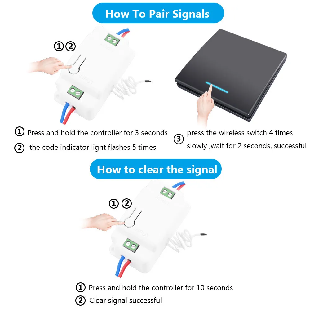 1. Нажмите и удерживайте контроллер в течение 3 секунд, чтобы войти в режим соответствия кода (светильник индикатора кода мигает 5 раз). В это время, нажмите беспроводной переключатель 4 раза медленно и подождите 2 секунды. Код успешен (по умолчанию всегда включен);