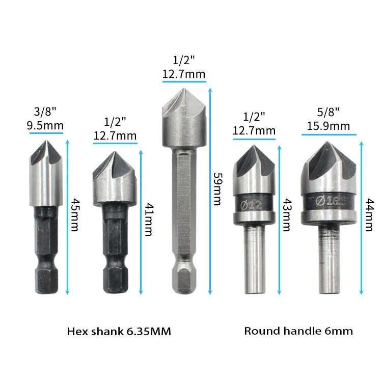 5 шт.: круглая ручка 1/2 (ie 12,7 мм), круглая ручка 5/8 (ie 15,9 мм), угол фаски 82 градуса.