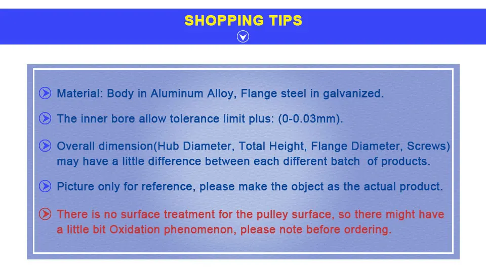Название продукта: шкив ГРМ Модель: XL20-AF-11mm Ширина ремня: 11 мм Диам. Отв.:5/6/6.35/7/8/10/12/12.7/14/15/16/17/18/19/20 мм Шаг зубьев: 5,08 мм Тип зубов: трапеция Общая высота: 15 мм Аксессуары: 2 * M4 Материал: алюминиевый сплав с оцинкованным железом Посылка: 1 шт. XL20-AF-11mm зубчатый шкив + 2 M4 Топ провода