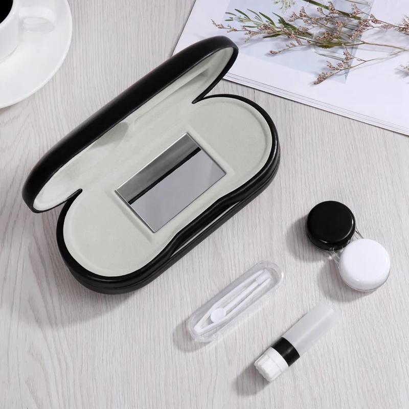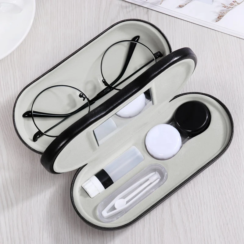 Конструкция двойного назначения-чехол имеет две стороны, одна для очков, другая для контактных линз и аксессуаров, включая 2 чехла для контактных линз s, небольшую бутылку и пару контактных пинцеты для линз.