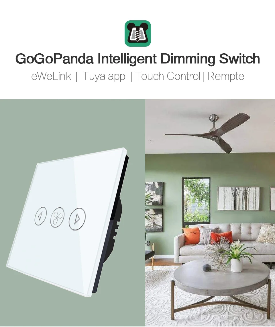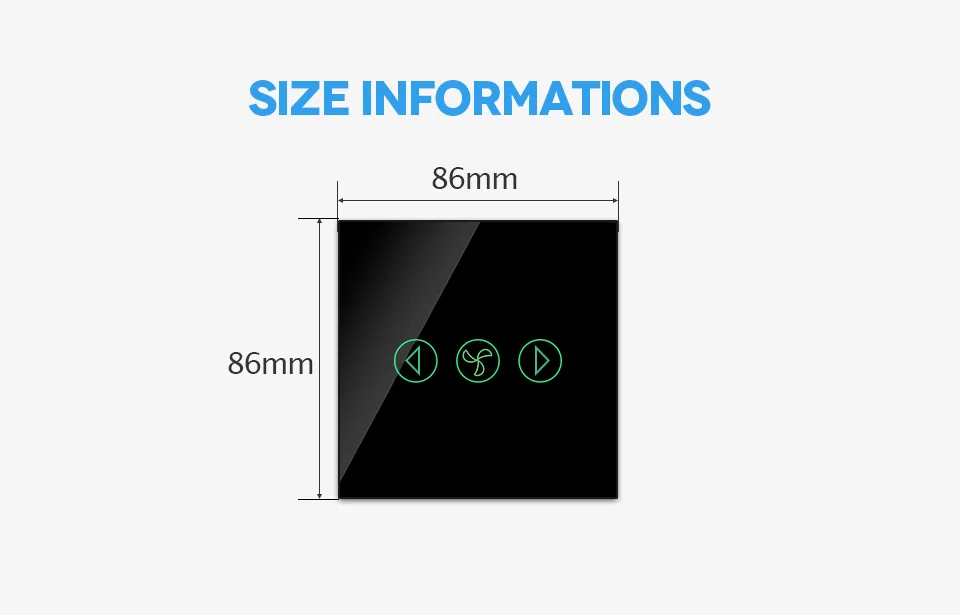 Технические характеристики Модель:ЕССтандартныйРежим:: Скорость вентилятораСенсорный диммер/wifi app SwitchМатериал панели: Хрустальное стеклоПанельНоминальная МощностьПо уровню поверхности: <300 wРазмер: 86 мм * 86 мм * 33 ммПитание:Null и живая линияСистема поддержки: Android \ iOSМодель wifi: Wi-Fi 2,4 ГГцПриложение: eWelink или Tuya AppСтандарт wifi: IEEE802.11b/g/nЦвет: черный/белый/золотой Шампань/серый