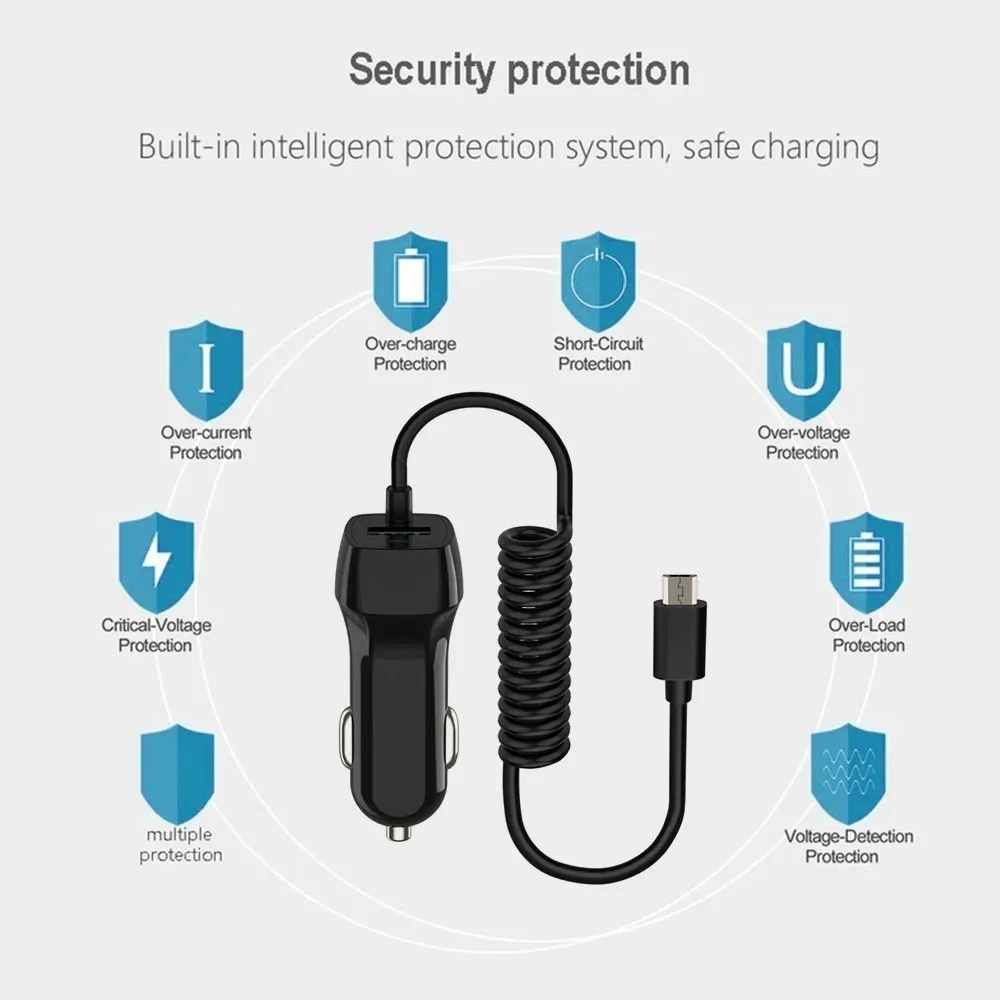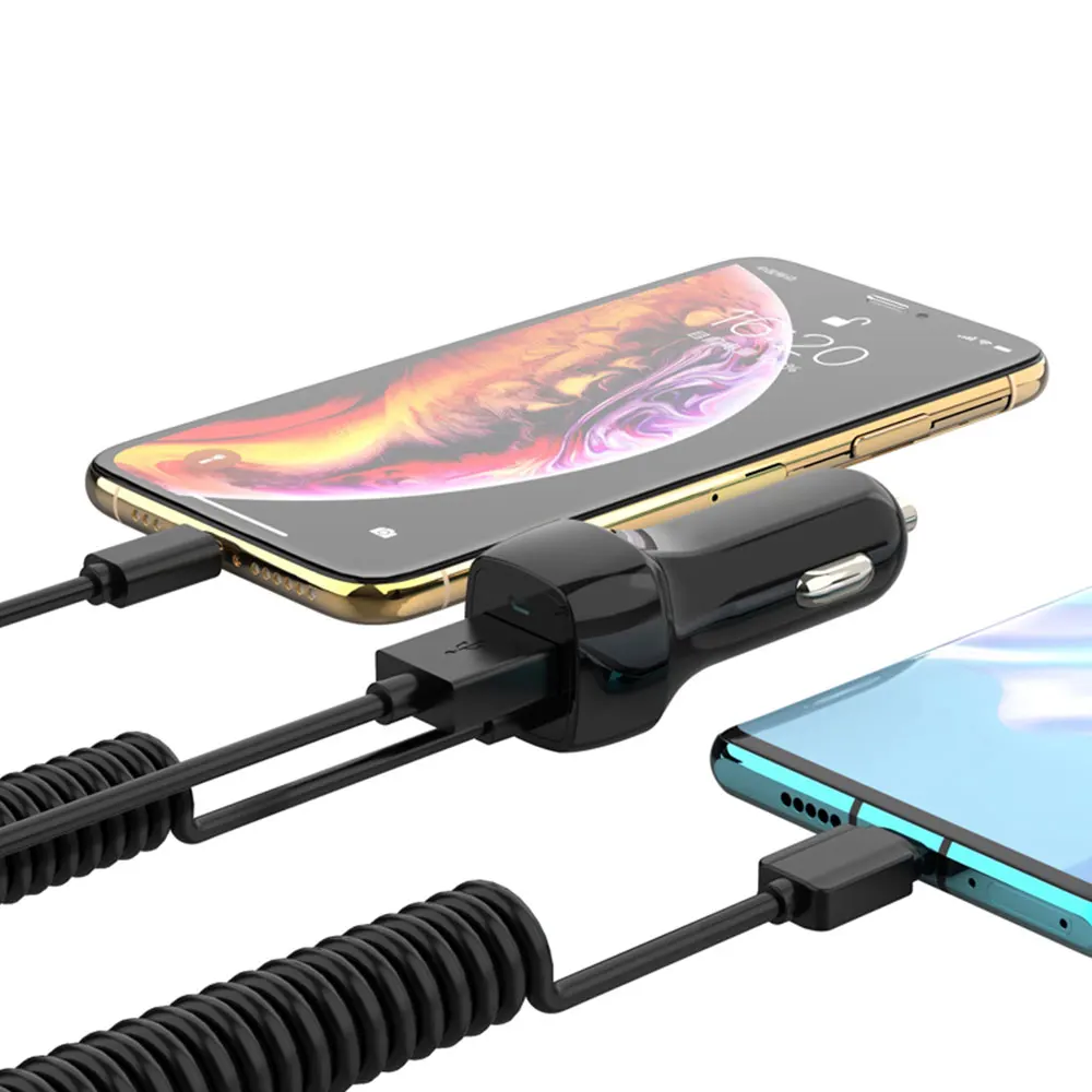 Цвет: черный Материал: PC пожаробезопасный материал Материал Входное напряжение: DC12-24V Ток на выходе: 5 в пост. Тока/2,4 А Сертификация продукта: FCC, CE, RoHS Характеристики продукта: USB, Micro usb, USB, освещение, USB, Type-C Характеристики: поставляется с кабелем для зарядки, а пружинный кабель может растягиваться до 150 см. Также есть интерфейс USB, который может заряжать несколько электронных устройств одновременно. Размер изделия: 7*2,5*2,3 см; Пружинная проволока длина: растягивается 150 см