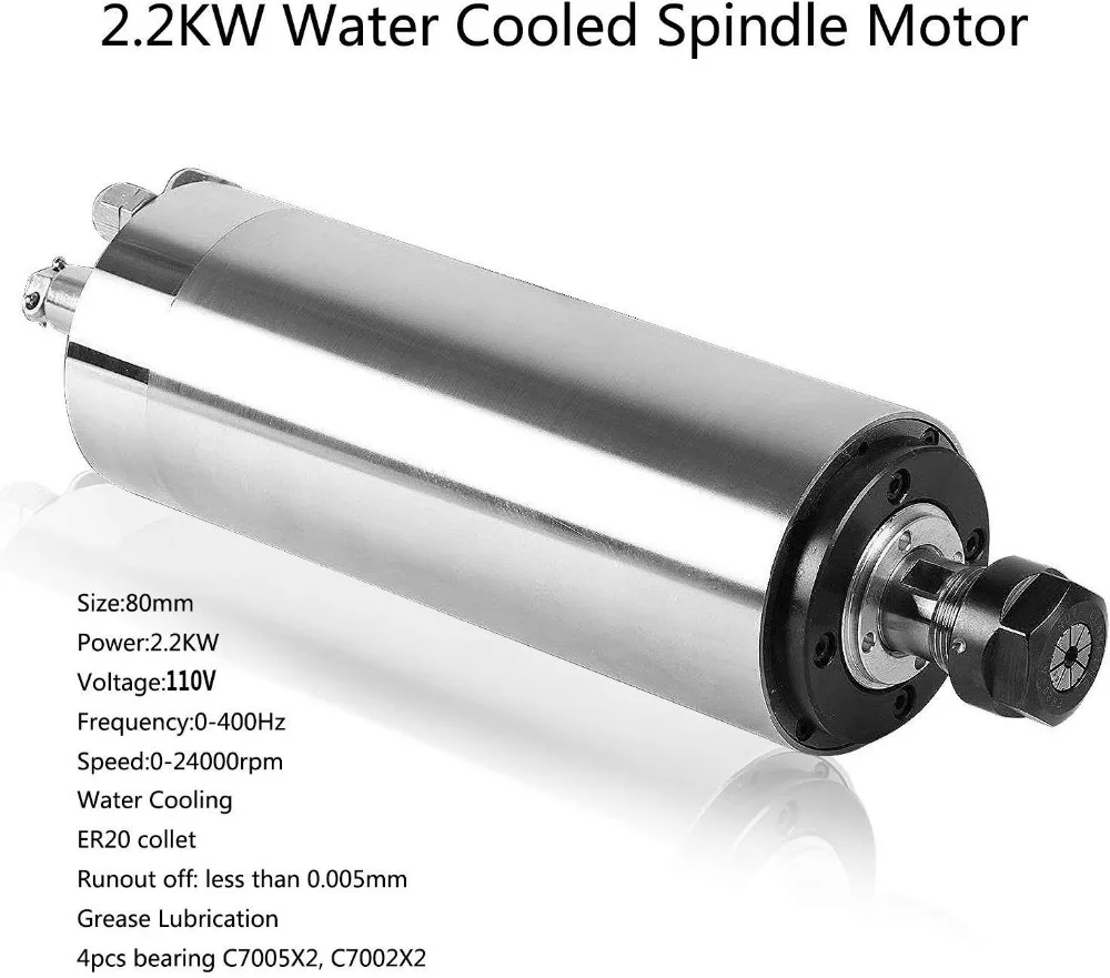 2.2 кВт набор:1x2,2 кВт CNC шпиндель с водяным охлаждением1x2,2 кВт VDF1x3,5 м водяной насос1 х 5 м водопроводные трубыШпиндельный зажим 1x80 мм13 x ER20 Цанга (1,2,3.175,4,5,6,7,8,9,10,11,12.7,13 мм)1,5 кВт набор: