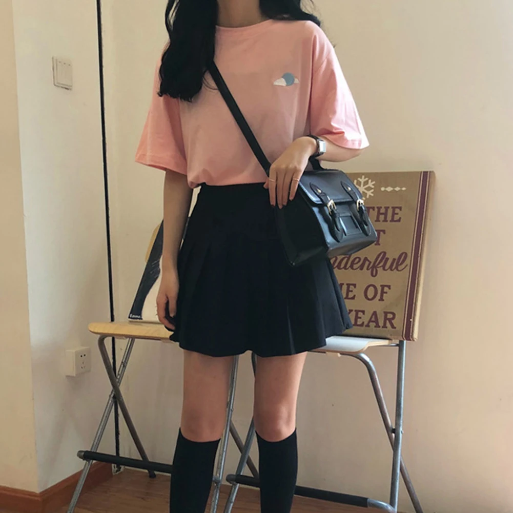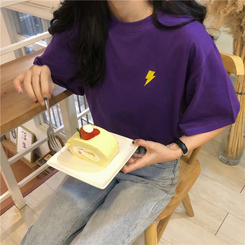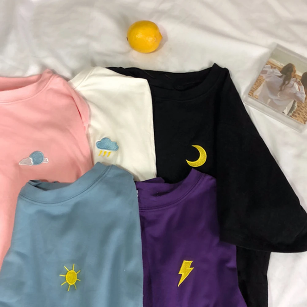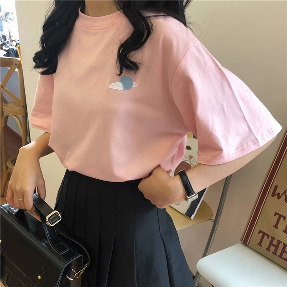 Женская свободная футболка с круглым вырезом и коротким рукавом с вышивкой