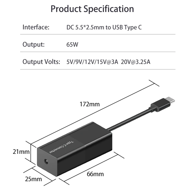 Из-за Тип USB C Выход-65 Вт макс, мы полагаем, что ваш переходник с внутренней резьбой с 5,5*2,5 мм разъем должен быть не менее 65 Вт. Пожалуйста, дважды проверьте перед покупкой.