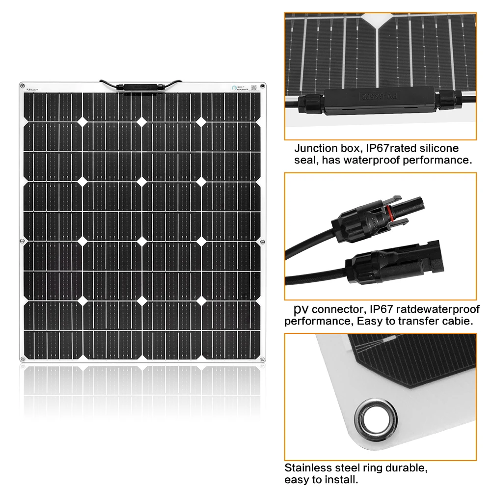 A. Выберите с высокой пропускной способностью 161*161 мм 12 PERC панель солнечной батареи из монокристаллического кремния ячейки, эффективности производства электроэнергии составляет около 1,3 раз больше, чем у обычных поликристаллические и общая площадь меньше в соответствии с одной и той же мощности. B. Используя процесс упаковки компонентов второго поколения, он тоньше, легче, мягче и имеет более длительный срок службы. C. Поверхность изготовлена из ПЭТ-материала, который обработан специальной технологией, чтобы сделать его более износостойким и повысить эффективность поглощения солнечного света. D. Он обладает высокой светильник с высоким коэффициентом пропускания, безопасно и надежно, не боится высокой температуры, и имеет нету опасности горения или взрыву. E. Распределительная коробка IP67 водонепроницаемая конструкция, включая байпасный диод, в цепи используется защита от перегрузки по току, дизайн обратной защиты. F. В сборке используется специальный фотоэлектрический кабель и специальный фотоэлектрический разъем MC4. Он безопасен, водонепроницаемый, устойчив к высоким температурам и погодным условиям для использования на открытом воздухе. Разъем MC4 прост в использовании, подключи и работай. G. Этот продукт является гибким компонентом солнечной энергии. Рекомендуется использовать с контроллерами и батареями. Он подходит для различных сцен, таких как RV, домашнее хозяйство, кемпинг, яхта, уличный светильник и солнечная электростанция.