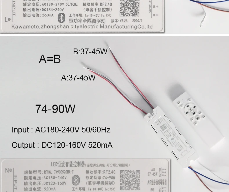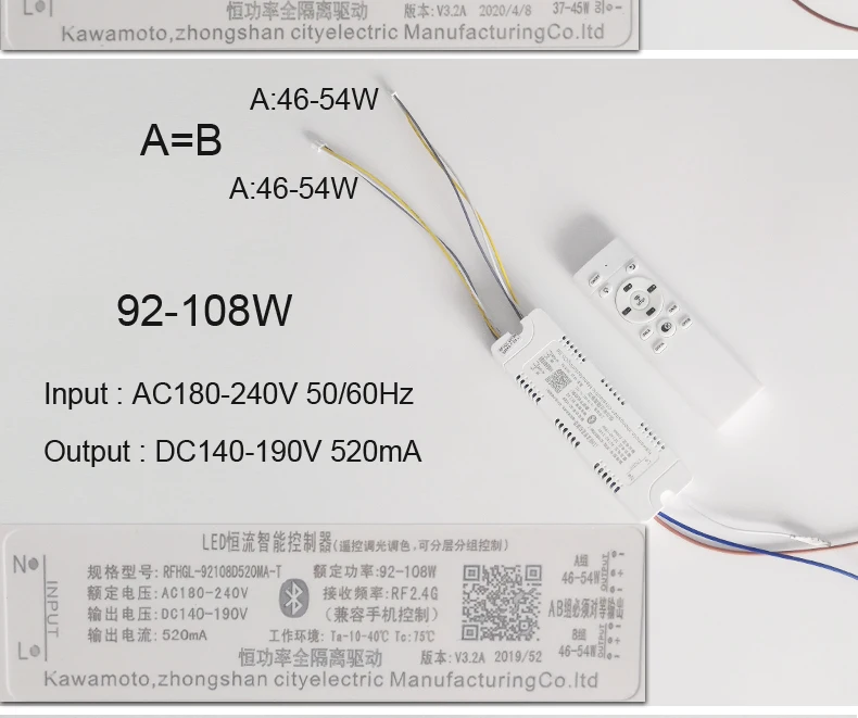 Технические характеристики Название: светодиодный драйвер 2,4G и APP control Мощность: 37-45 Вт 46-54 Вт 58-72 Вт 74-90 Вт 92-108 ВТ Вход: AC180-260V 50/60Hz Выход: DC120-160V 260mA DC140-190V 260mA DC184-240V 260mA DC120-160V 520mA DC140-190V 520mA Удаленное Расстояние: менее 30 метров