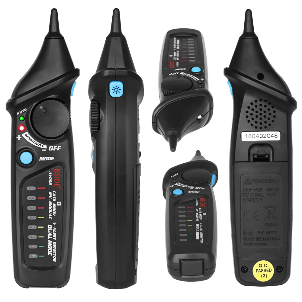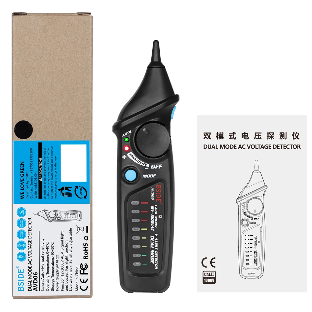 Диапазон тестирования напряжения переменного тока: 12 В ~ 1000 В (ручной режим) 48 В ~ 1000 В (автоматический режим) Материал: АБС-пластик. Уровень безопасности: CAT II 1000V. Соответствие международным стандартам безопасности. Уникальный дизайн и отличная функция: BSIDE AVD06 имеет уникальный и Лидирующий дизайн, который отличается от традиционных тестеров напряжения (может использоваться в качестве идеального подарка для родственников, друзей, коллег).