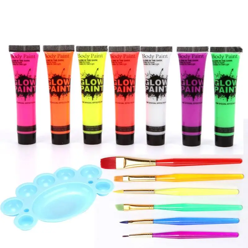 Примечание: 1. Только для кожи и другой гладкой поверхности; Пожалуйста, не позволяйте вашим детям или любому другому случайно проглотить продукт. 2. Если возникают какие-либо дискомфорта, пожалуйста, немедленно прекратите использование или обратитесь к врачу. 3. Не менее 10-20 минут воздействия солнечного света или лампы необходимо для достижения флуоресцентного эффекта. 4. Цвет товара, отображаемый на фотографиях, может немного отличаться от реального объекта из-за различных мониторов или других факторов. Спасибо за понимание. Посылка включает в себя: 7 трубок x краска для тела. 6 шт х кисти, 1 шт. x палитры.