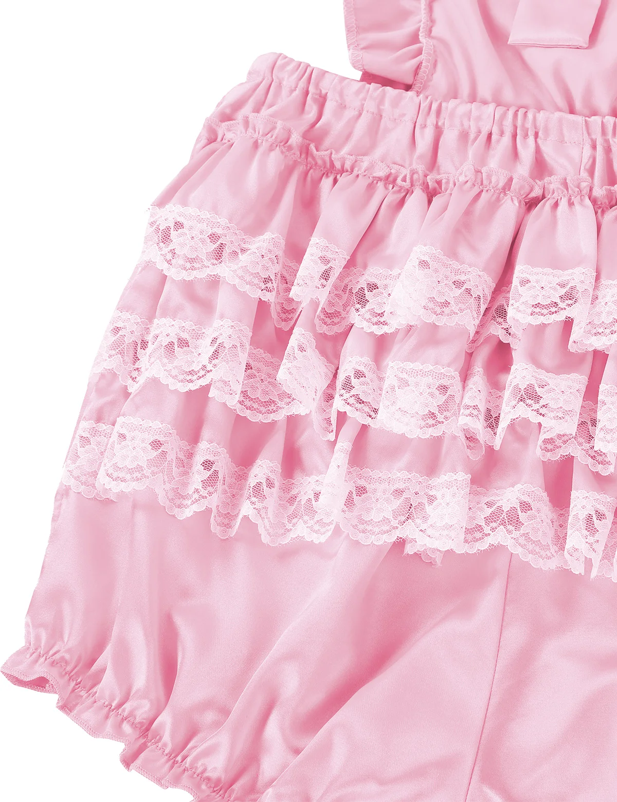 Вырез на шее, без рукавов и с открытой спиной, украшенный тремя слоями гофрированного кружева на подоле, эластичная резинка на талии и эластичный вырез для удобной посадки.