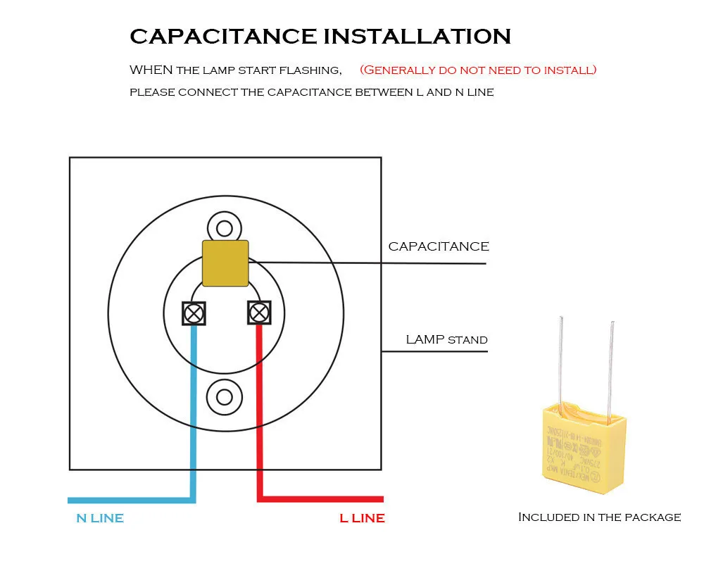 Когда лампа начинает мигать, Пожалуйста, подключите емкость между l и n линией (лампа с мощностью выше 3W, как правило, не нужно устанавливать)