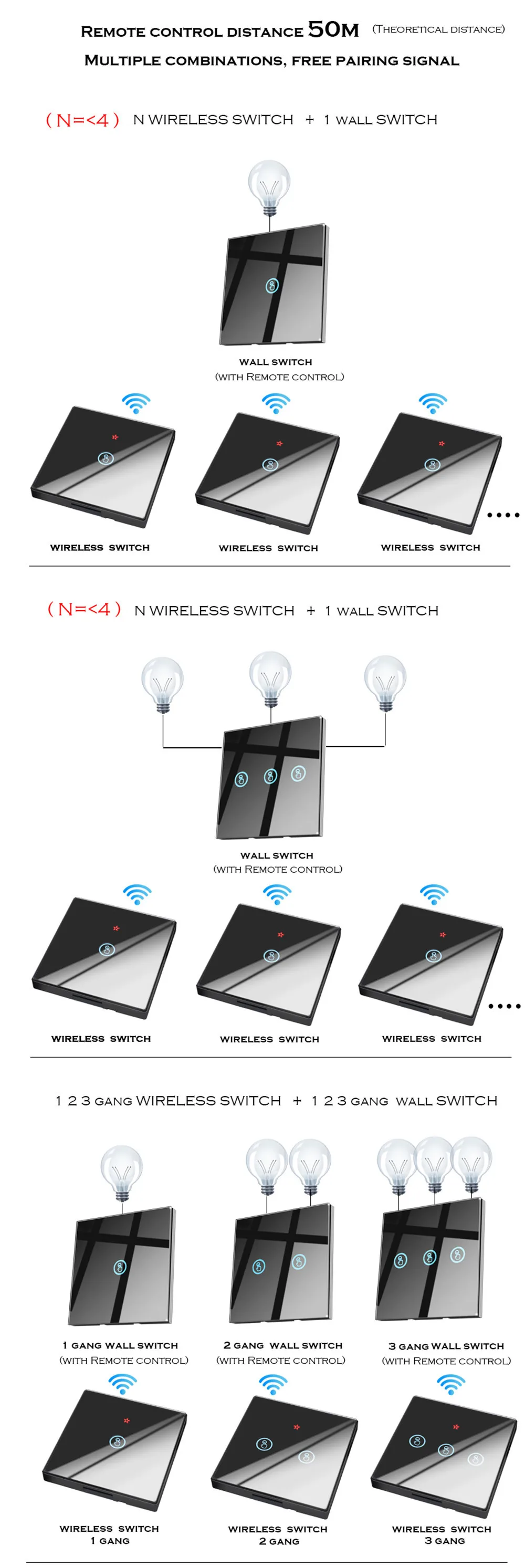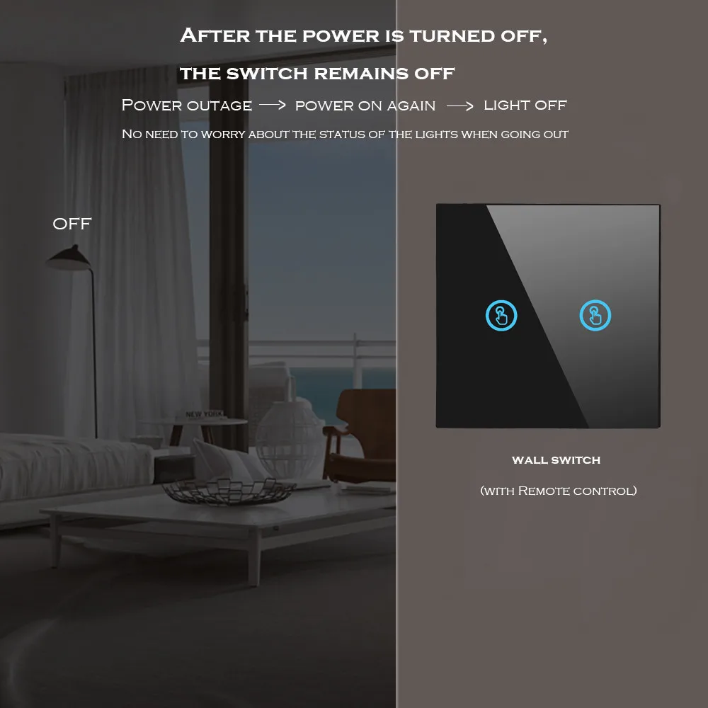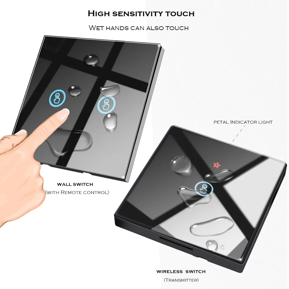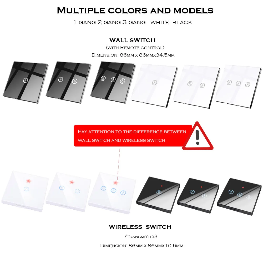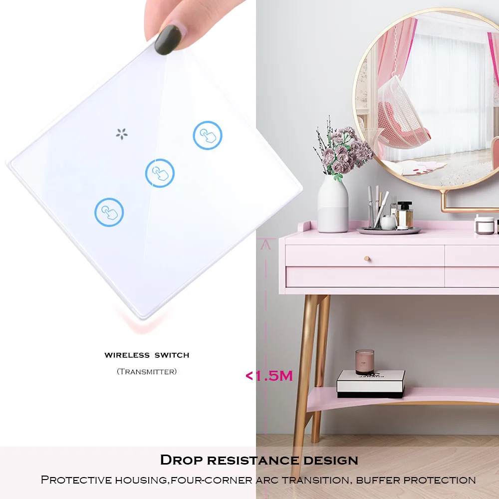 1. функция дистанционного управления: Да 2, рабочее напряжение: переменный ток 110-240 В 60 Гц/50 Гц 3, рабочая частота: 433,92 МГц 4. мощность нагрузки: 3-150 Вт/комплект. 500 Вт/всего 5. размер: 86*86*34,5 мм, 6, Рабочая температура:-20 elsius ~ + 70 по Цельсию 7. после отключения питания настенный выключатель остается выключенным
