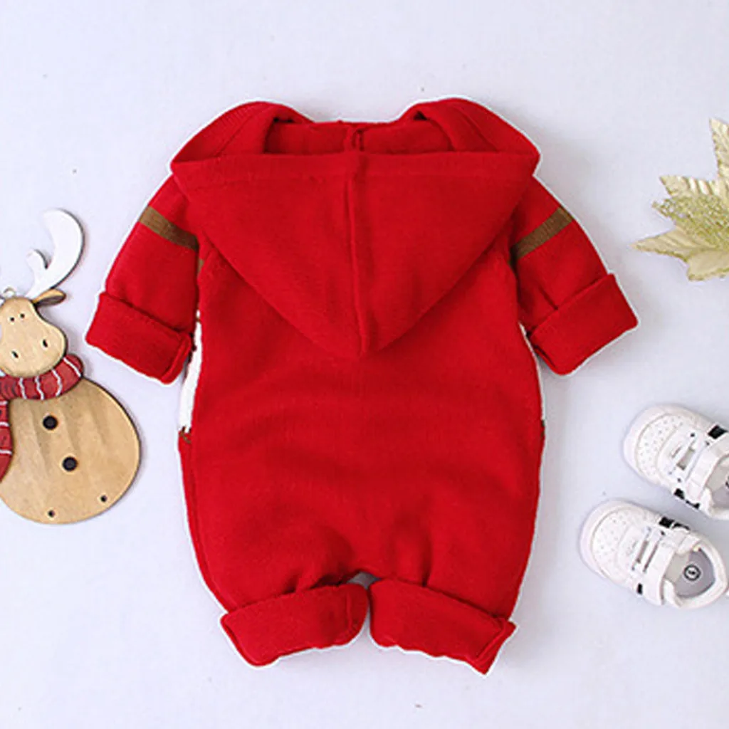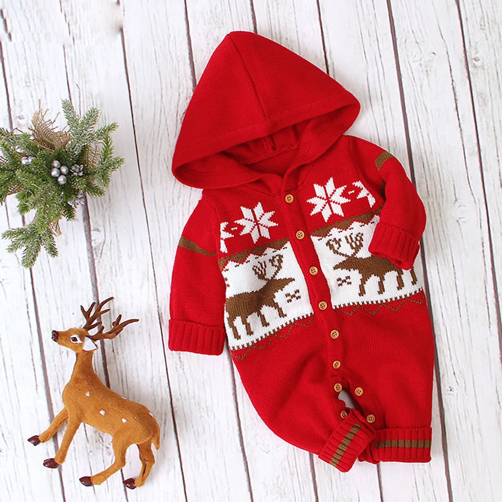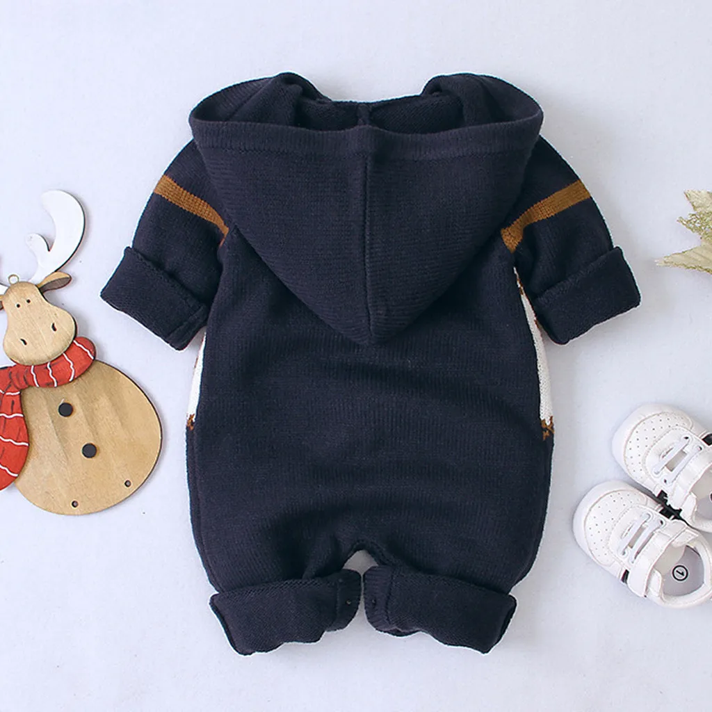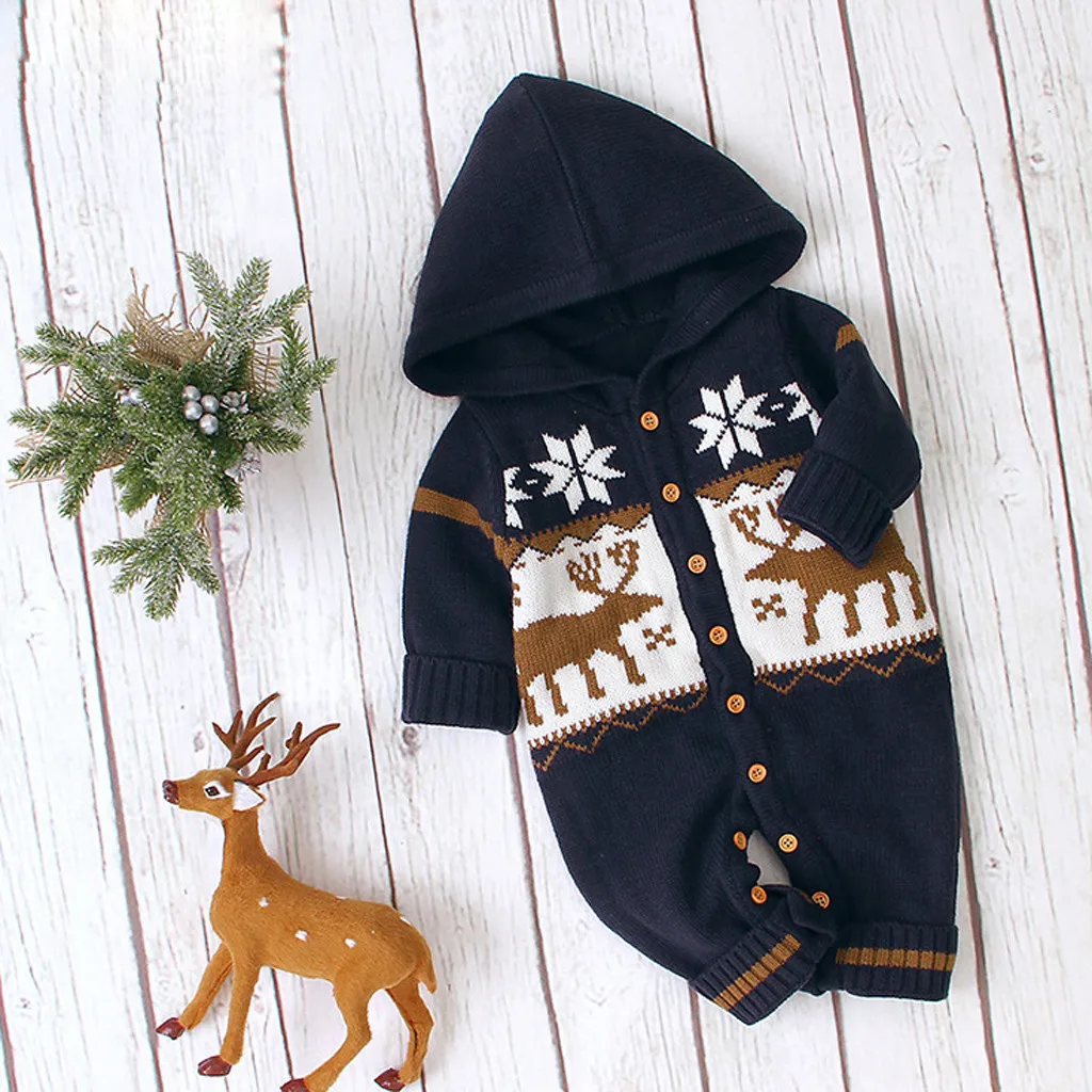 Зимний Рождественский Вязаный комбинезон с капюшоном и рисунком оленя для новорожденных мальчиков и девочек
