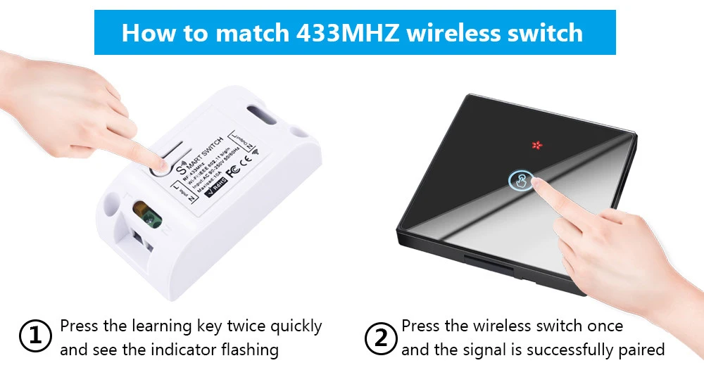 1. Дважды нажмите клавишу обучения и убедитесь, что индикатор мигает 2. Один раз нажмите беспроводной переключатель, и сигнал успешно сработает