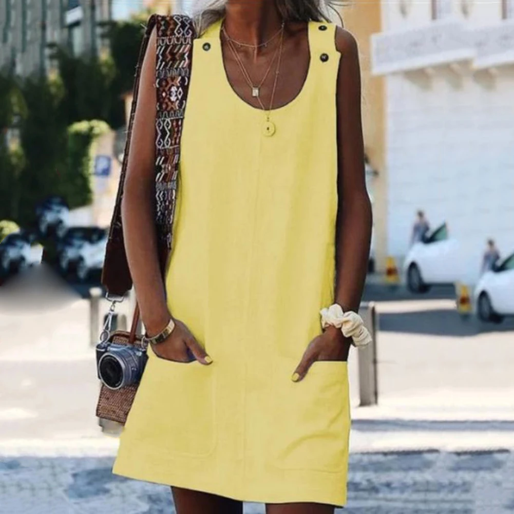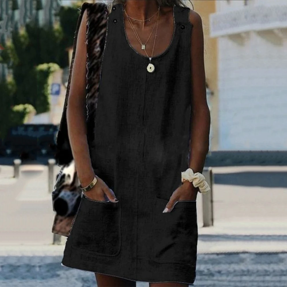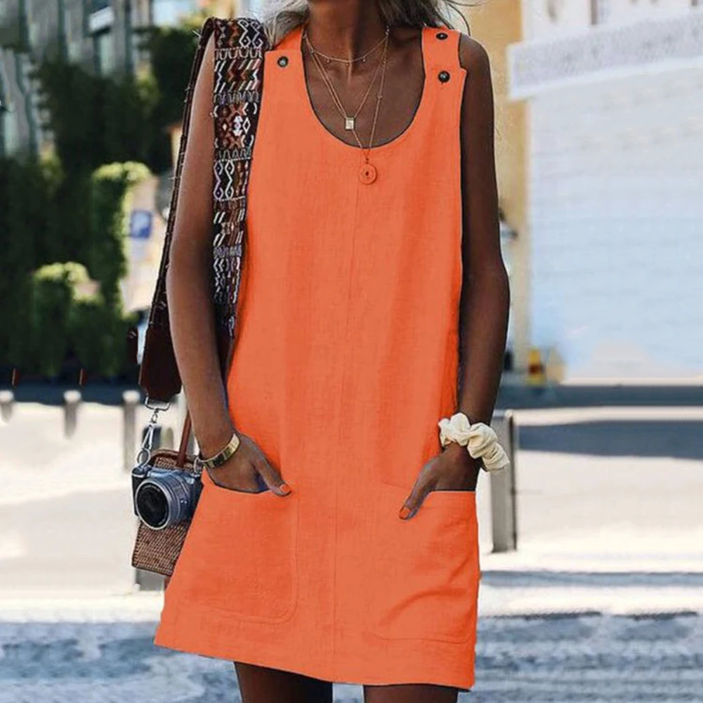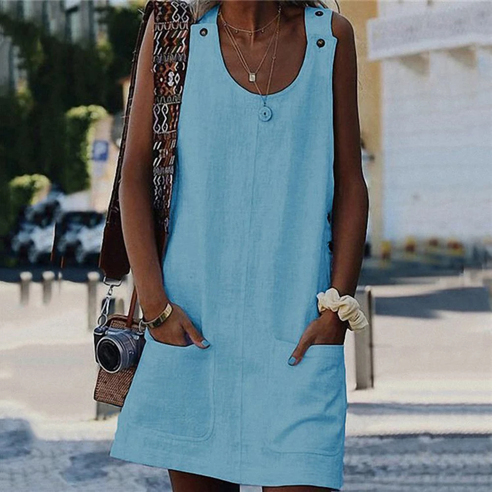 Пляжное повседневное женское однотонное мини-платье с карманами без рукавов, сарафан на пуговицах