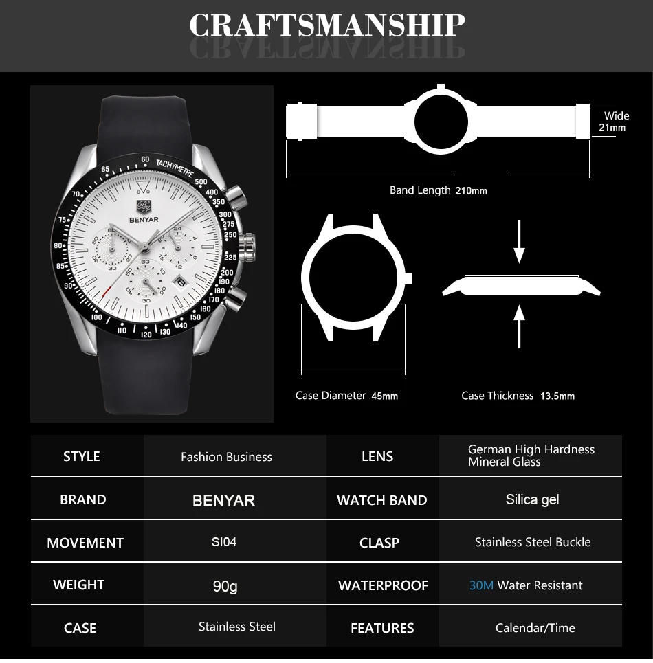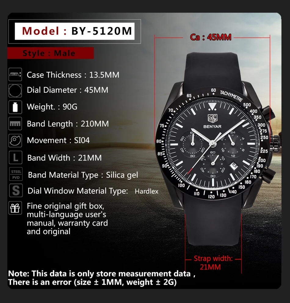 Бренд: BENYAR Модель: BY-5120 Диаметр циферблата: 4,5 см Толщина корпуса: 1,35 см Длина ремешка: 21 см Ширина полосы: 2,1 см Вес: 90 г Водонепроницаемость: 3 АТМ