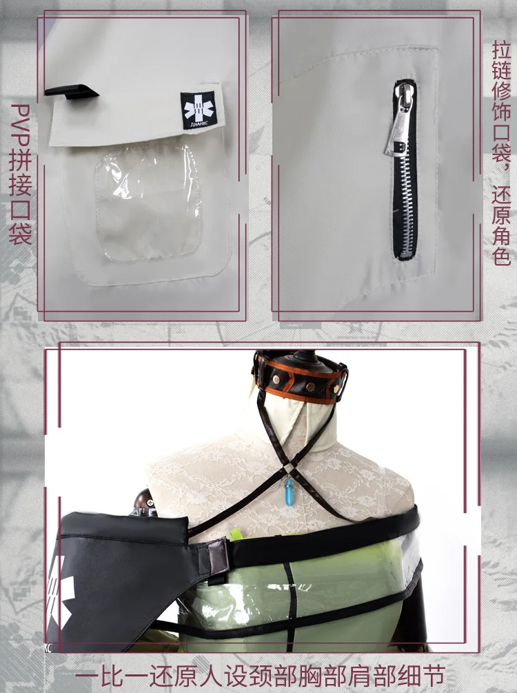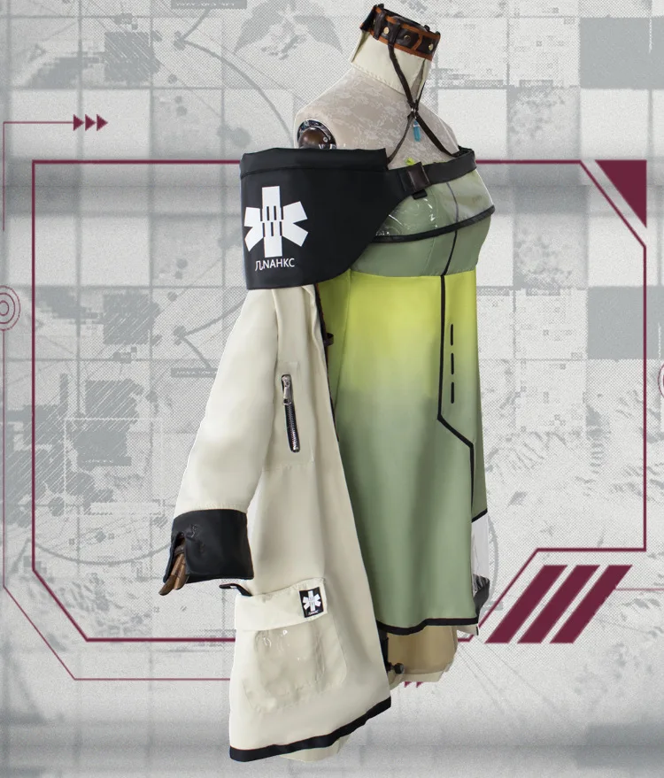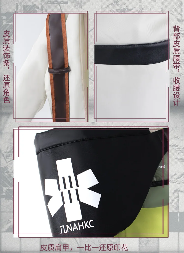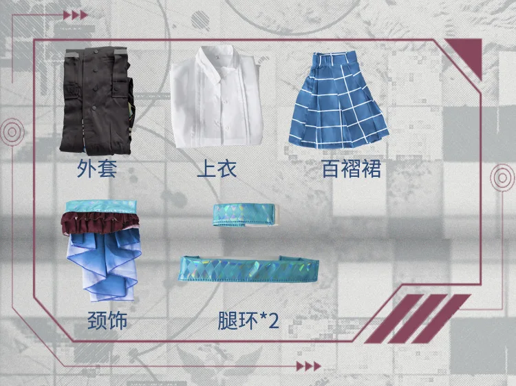 Amiya: пальто + рубашка + галстук-бабочка + плиссированная юбка + аксессуар Exusiai: топ + юбка + Гольфы + манжета + карта + сумка Kaltist: пальто + платье-футболка + безрукавка + аксессуар