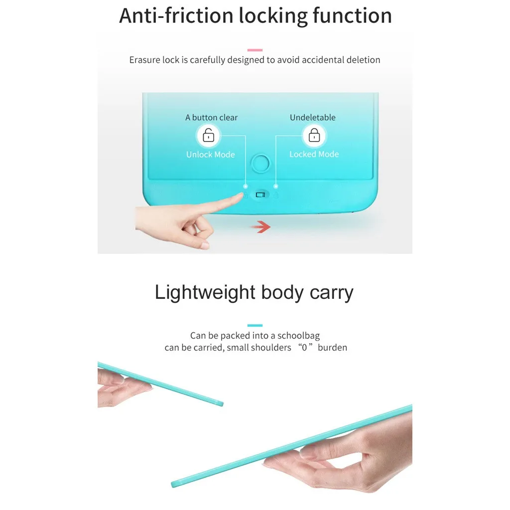 100% новый и высокий Качество. Новая форма, толстая и простая, новая матовая поверхность, минимализм Рамка, ручку можно использовать в качестве кронштейна, а на задней стороне есть магнитная наклейка Для простой установки. Особенности продукта: ЖК-дисплей Письмо, частичное удаление, противоударный, безопасный и экологический. Добавьте функцию умного блокировки: После написания содержимого под изделием есть функция блокировки, не Вы можете по ошибке Удалить содержимое! Материал: Гибкая жидкость Прозрачная пленка, корпус из АБС и поликарбоната Метод записи: давление Сенсор Режим стирания: один щелчок Стирать, частичное удаление Цвет пленки: черный Тип аккумулятора: кнопочный аккумулятор Срок службы: 5-10 лет Срок службы: 6-12 месяцев Нет пыли и цвета, нет Загрязнение Держите подальше от радиации, скажем Попрощайтесь с мобильными телефонами и планшетами Легко рассчитывать арифметику, И речь слова Сохраните бумагу и напишите больше Более 100000 разПримечание: