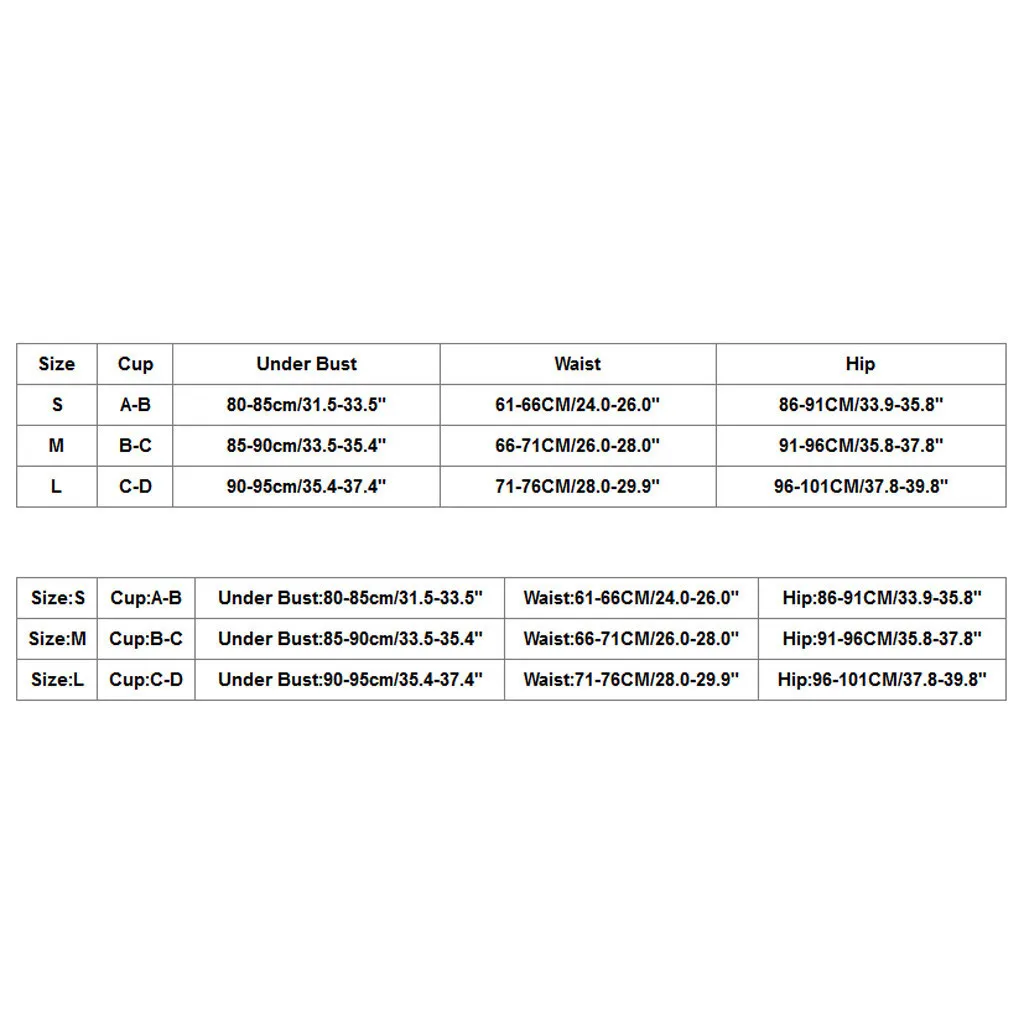 Размер Чашка Под грудью Талия Бедра S A-B 80-85 см/31,5-33,5" 61-66 см/24,0-26,0" 86-91 см/33,9-35,8" М B-C 85-90 см/33,5-35,4" 66-71 см/26,0-28,0" 91-96 см/35,8-37,8" L C-D 90-95 см/35,4-37,4" 71-76 см/28,0-29,9" 96-101 см/37,8-39,8"