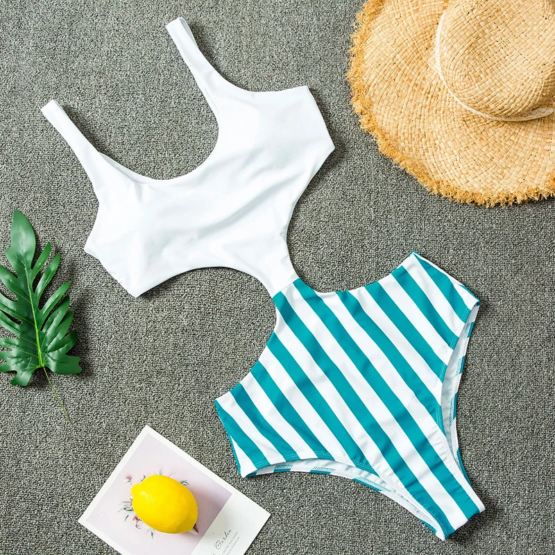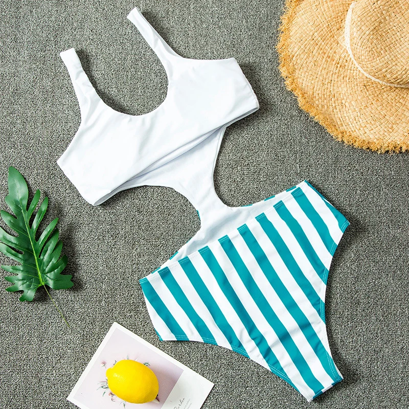 Пуш-Ап купальный костюм для женщин, полоски, высокая талия, купальник для женщин, купальный костюм, полый Монокини, сексуальная пляжная одежда для плавания