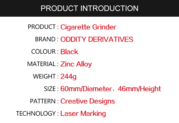Название продукта: измельчитель для сигарет Бренд: производные Oddity Материал: цинковый сплав Вес: 244 г Цвет: ледяной черный Размер: 60 мм/диаметр, 46 мм/высота, Технология обработки: лазерная маркировка Узор: цитаты курения Форма: круглая Посылка в комплекте: сигарета GrinderX 1 шт.