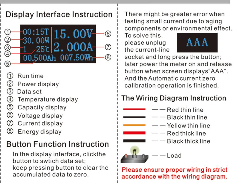 Старение компонентов и изменение температуры после длительного использования могут появиться небольшие погрешности, когда он измеряет малый ток. Чтобы избежать этой ошибки, вы можете отсоединить текущее гнездо провода и сохранить нажатие кнопки для подключения источника питания, пока на экране не будет отображаться «AAA», а затем разболтается кнопка.