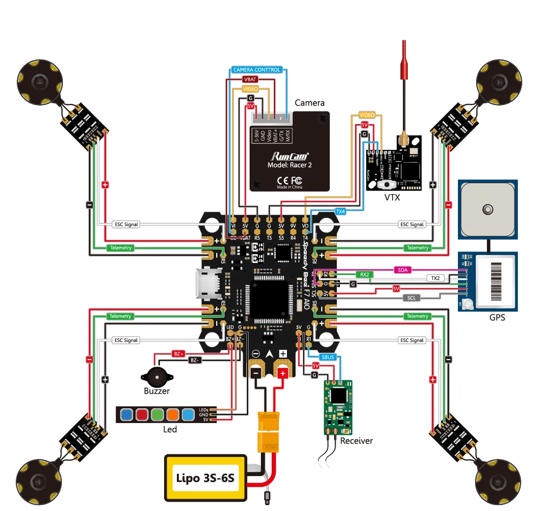 Описание продукта: F7 AIO игровые джойстики Новый макет новая Особенности F7 AIO игровые джойстики Поддержка 4in1 ESC 8-контактный разъем или припой колодки два способа подключения F7 AIO игровые джойстики Лучшая Поддержка высоких токов 5*5,0 в/1*9,0 в выход (макс. А) F7 AIO игровые джойстики F7 AIO игровые джойстики F7 AIO игровые джойстики BLE модуль интегрированный 0 конфигурация Настройка параметров FC через мобильное устройство IOS 10,0 +: iPhone4S, iPad 3-го поколения и более поздних версий APP Store Android 4,3 +: Google Play, скачать * Дроссельная заслонка, модуль Bluetooth автоматически деактивируется Дроссельная заслонка, модуль Bluetooth активируется автоматически Проводка руководство F7 AIO игровые джойстики Встроенный bluetooth-чип Нулевая конфигурация, подключение к быстрому приложение Bee непосредственно после включения, легко установить параметры FC Посылка F7 AIO игровые джойстики Технические характеристики MCU: STM32F722 IMU: ICM20689 Баро: BMP280 (IEC) OSD: BetaFlight OSD с чипом AT7456E Модуль BLE: внутреннее подключение к UART3 для удаленной настройки с приложением SpeedyBee или другими аналогичными приложениями BlackBox: 32 МБ бортовой dataflash Датчик тока: 200A (шкала 102) Панель управления камеры BetaFlight: Да Входная мощность: 3 s-6s Lipo Выходная мощность: 5 V * 5 (включая BZ +), максимальный ток нагрузки 2.5A. 9 в * 1, максимальный ток нагрузки 2,5 А. Выходная мощность ESC: 4 * VCC выход UART: UART колодки * 4 (UART1, UART2, UART4, UART5) Вход RSSI: вход RSSI припой SmartPort: Используйте Softserial1 для поддержки SmartPort Iec: используется для внешнего магнитометра, гидролокатора и т. Д. Зуммер: BZ + и BZ-pad используется для 5 в зуммер Сигнал ESC: S1-S5 Светодиодный штырь: используется для WS2812 светодиодный Кнопка загрузки: используется для легкого входа в режим DFU Вес ≈8. 8 г Размер: 36,5*44*7 м