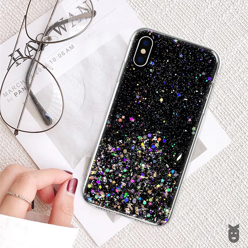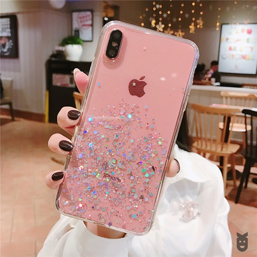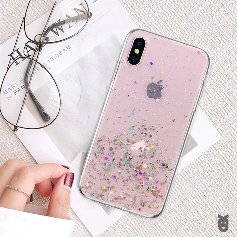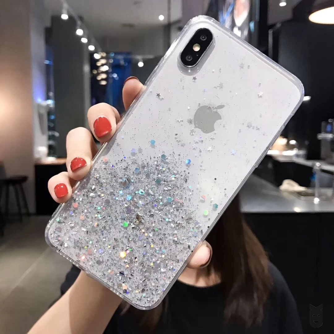 Блестящий блестящий чехол с блестками для Apple iPhone 11 Pro XS MAX X XR 8 7 6 6s Plus, золотой фольгой, звездами, мягкий прозрачный чехол из ТПУ, оболочка