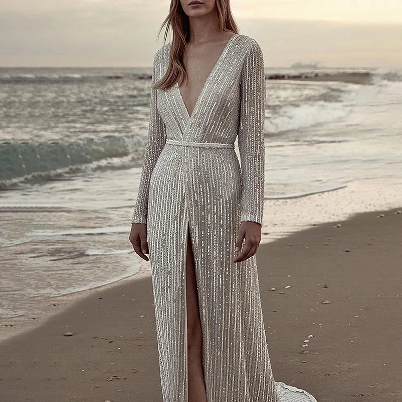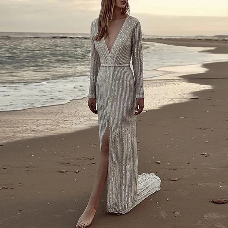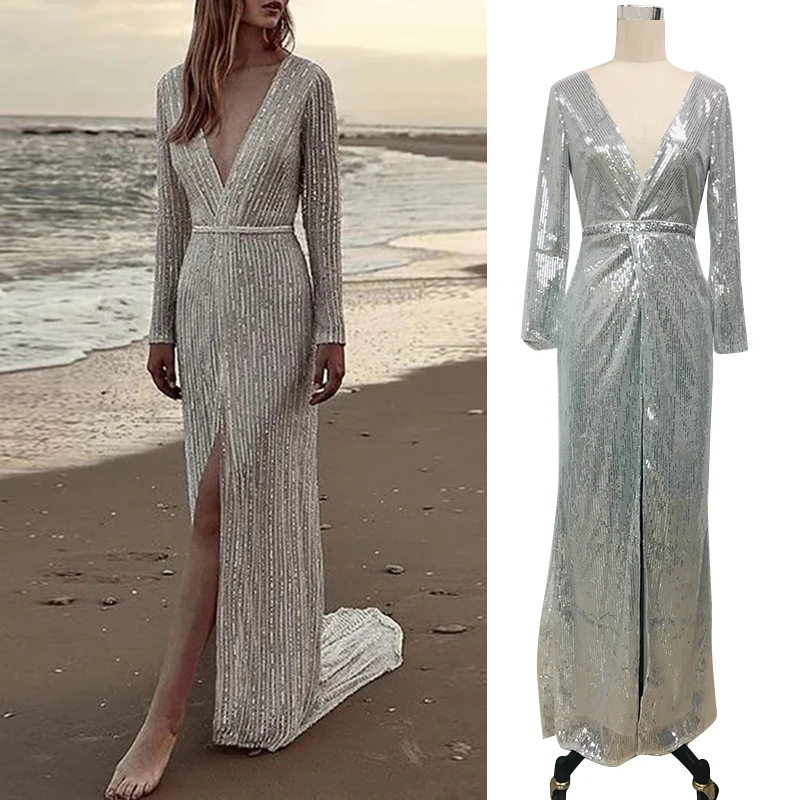 * Item Description: Sequin, Deep V-Neck, Split, Evening Party, Ball Gown, Long Maxi Dress