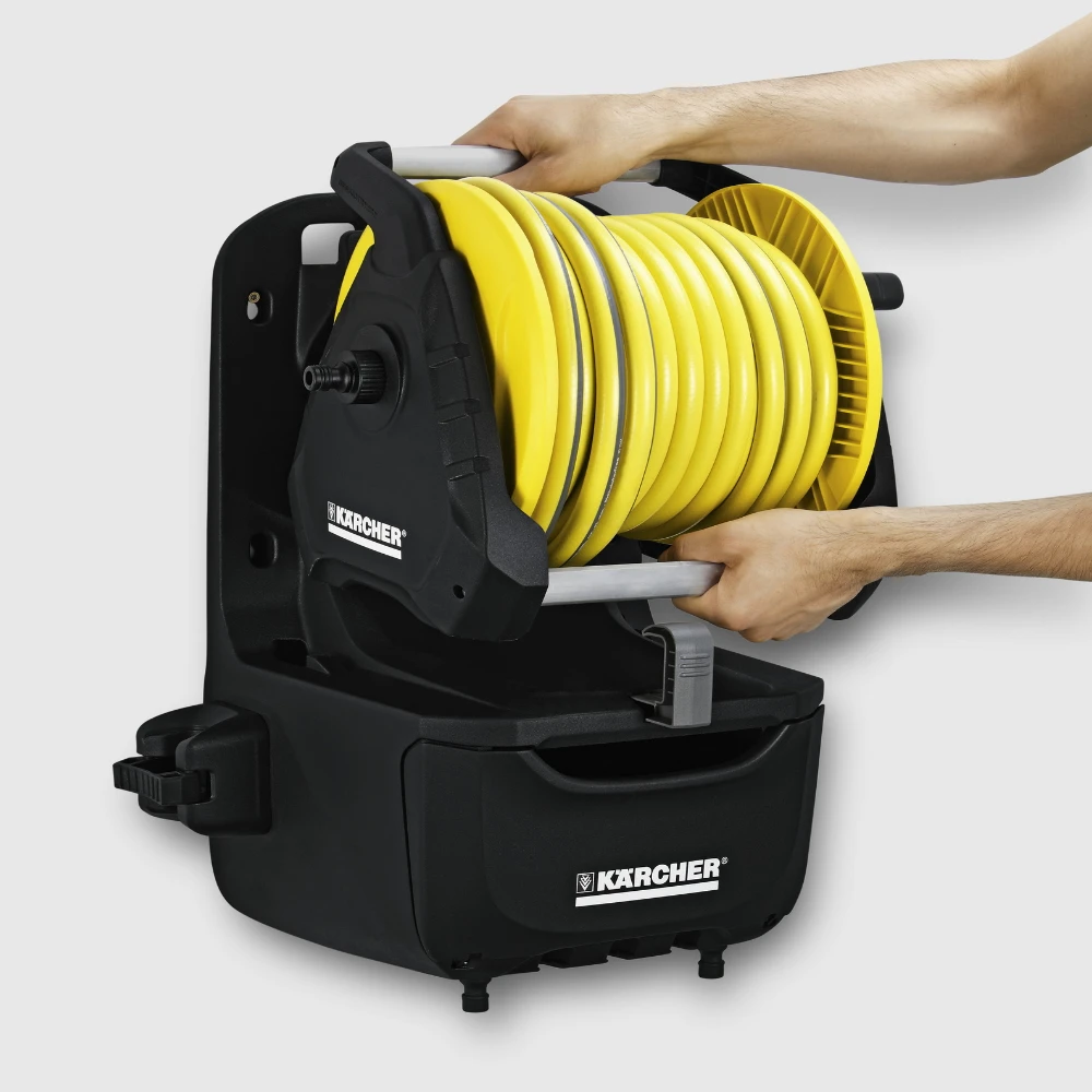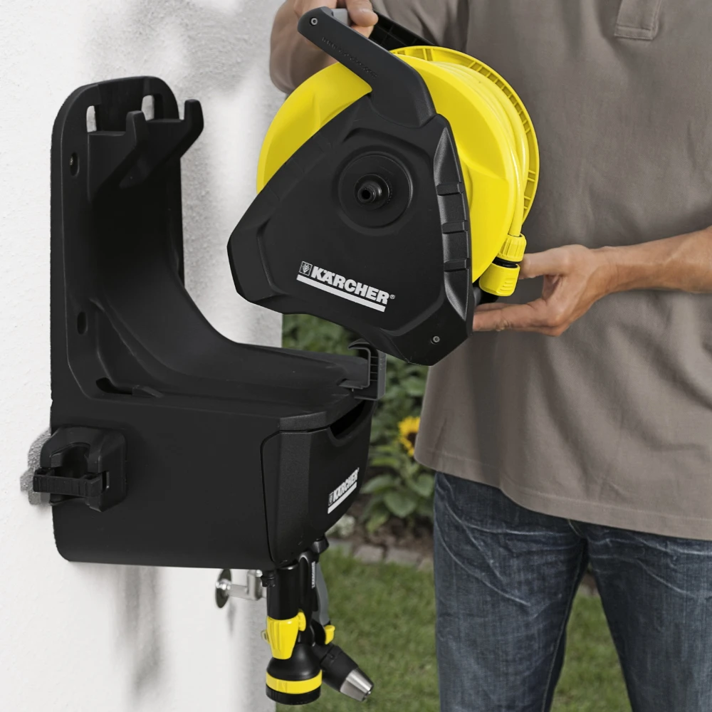 Катушка для шланга «Premium» HR 7.315 (в комплекте, 1/2"). В комплекте: катушка для шланга «Premium» HR 7.300, с настенным кронштейном, шлангом 1/2" PrimoFlex® (15 м), распылителем для полива, 3 коннекторами, 1 коннектором с функцией «Aqua Stop» и штуцером для присоединения к крану G3/4 с переходником G1/2. В смонтированном состоянии.
