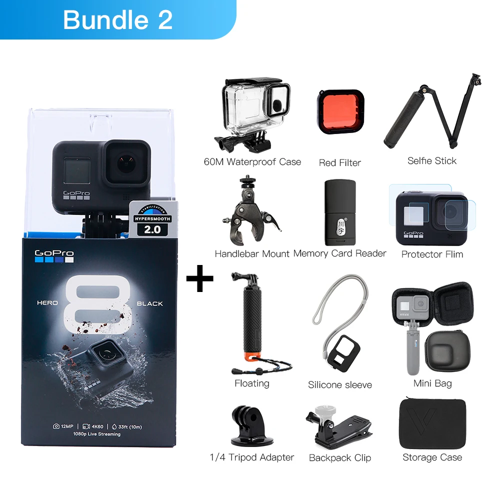 1 * Официальный стандарт 1 * защитная пленка 1 * Selife Stick 1 * считыватель карт памяти 1 * силиконовый чехол 1 * мини-сумка 1*60 м водонепроницаемый чехол 1 * красный фильтр 1 * крепление на руль 1 * Плавающий 1*1/4 Ttrpod адаптер 1 * зажим для рюкзака 1 * чехол для хранения