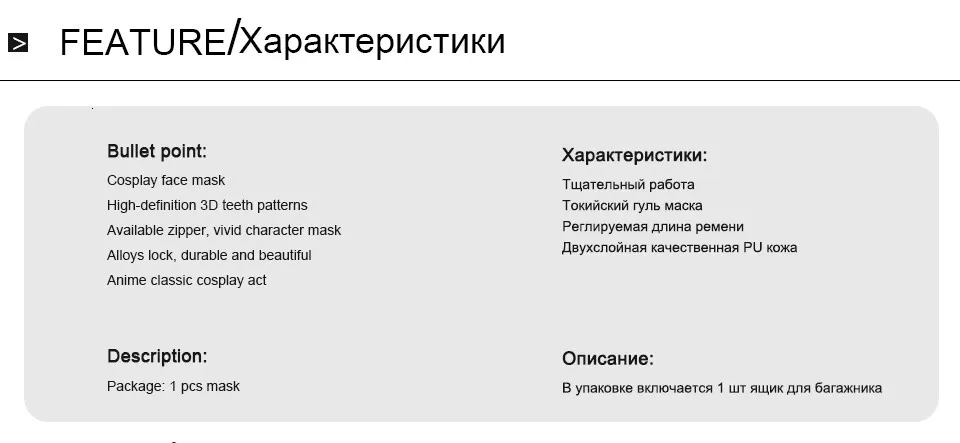 Описание: 100% новый бренд и высокого качества Материал: искусственная кожа, нержавеющая сталь, сплав Цвет: как на изображении Идеальный реквизит для костюмированной игры Застежка-молния из сплава, возможность открывать или закрывать рот Заклепки прочно фиксированные углы накладки на глаза Задняя сторона маски регулируется, более плотно прилегает к лицу без давления Патч-Размер: Общая длина 64 см/25,19 ", высота 7 см/2,76" Размер маски: общая длина 70 см/27,56 дюйма, Высота 22 см/8,66 дюйма Поверхность с регулируемой кнопкой, можно настроить его для ношения Количество: 1 шт. Посылка включает в себя: 1 шт. маска (1 маска + 1 пластырь)