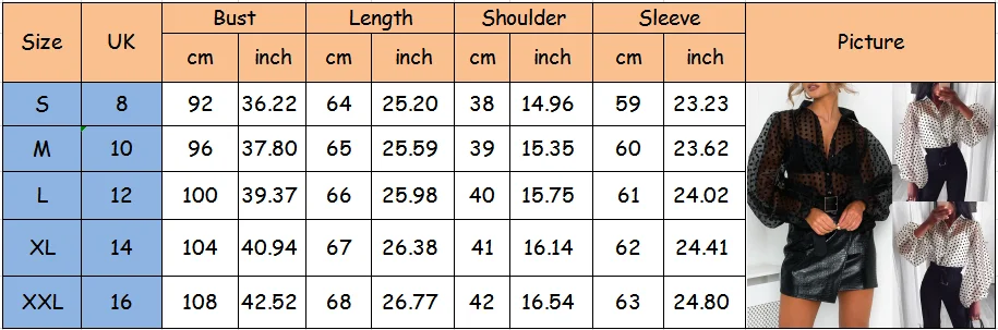 Параметры: 100 см абсолютно новый высококачественный Стиль:Повседневный стиль, мода Блузка Полупрозрачные, Прозрачное нижнее белье Длина рукава: длинный рукав Рукав styleuff рукав Мероприятия: вечерние,Клубная, повседневная, повседневная одежда и т. д. Рисунок: узор в горошек Цвет: белый, черный Материал: спандекс Размеры: S, M, L,XL,2XL Размеры таблицей: