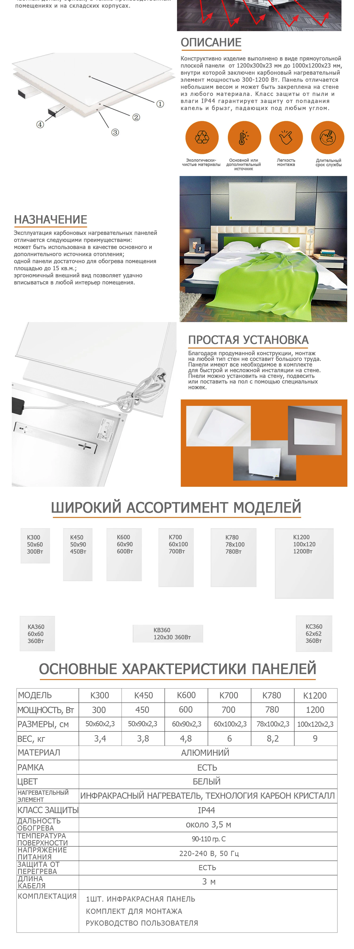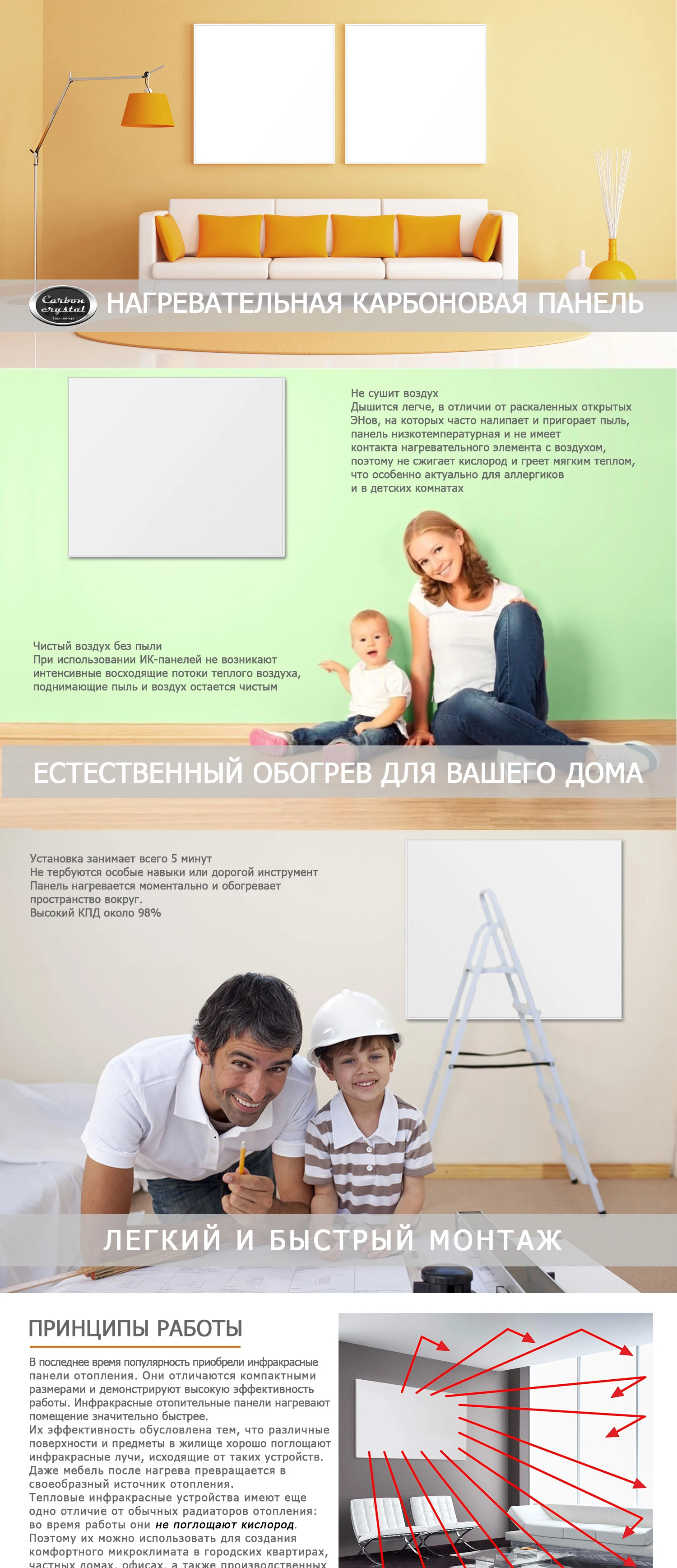 Мощность обогрева 300 Вт обеспечивает комфортное и приятное тепло в каждой комнате Простая установка-готов к использованию Огромные затраты и экономия энергии по сравнению с обычными обогревателями Новейшие технологии: высокая эффективность благодаря эффективным углеродным кристаллическим нагревательным элементам Потолочные и настенные монтажные детали могут быть описаны выше, привлекая и обеспечивая доверие к вашим потенциальным потребителям.