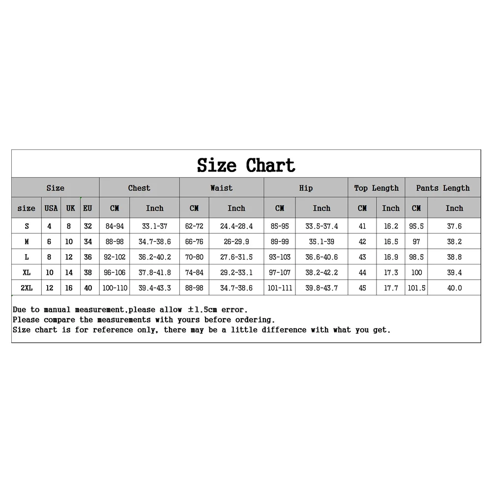 [Наш Размер S] Обхват груди: 88 см-94 см/33,1 "-37", обхват бедер: 85 см-95 см/33,5 "-37,4", обхват талии: 62 см-72 см/24,4 "-28,4", Длина топа: 41 см/16,2 ", длина брюк: 95,5 см/37,6" (прибл.)