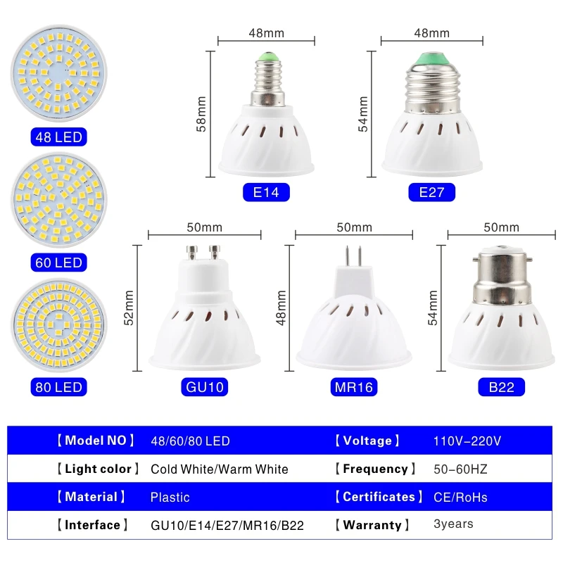 Напряжение: AC/110V220V Разъем: MR16/GU10/E27/E14/B22 Светодиодный индикатор: 48 шт./60 шт./80 шт. Цветовая температура: холодный белый 6000-6500 K/теплый белый 2800-3200 K Угол пучка: 360 градусов Срок службы:> 50000 часов Ультратонкое естественное освещение CRI> 85Ra