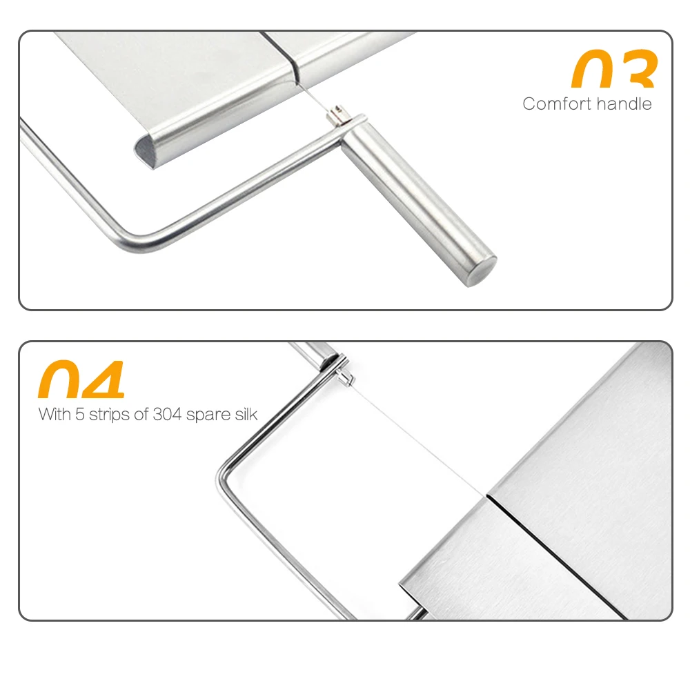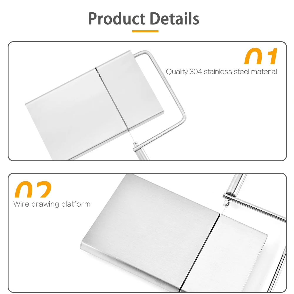 1. Изготовлен из пищевой нержавеющей стали и нескользящими резиновыми ножками. 2. Прочный и долговечный, легко проходит через твердых и мягких сыров. 3. 7,5 см ложки с длинной ручкой, обеспечивает удобный захват, вы можете отрезать через сыр легко. 4. Non-Slip база идеально размер затрудняетесь в выборе правильного размера, чтобы провести стандартный блок сыра. 5. Подходит для нарезки сыра, масла, фруктов и овощей. 6. Идеальный подарок на день рождения, время, держащих букет невесты на свадьбе, Рождества и других случаев.