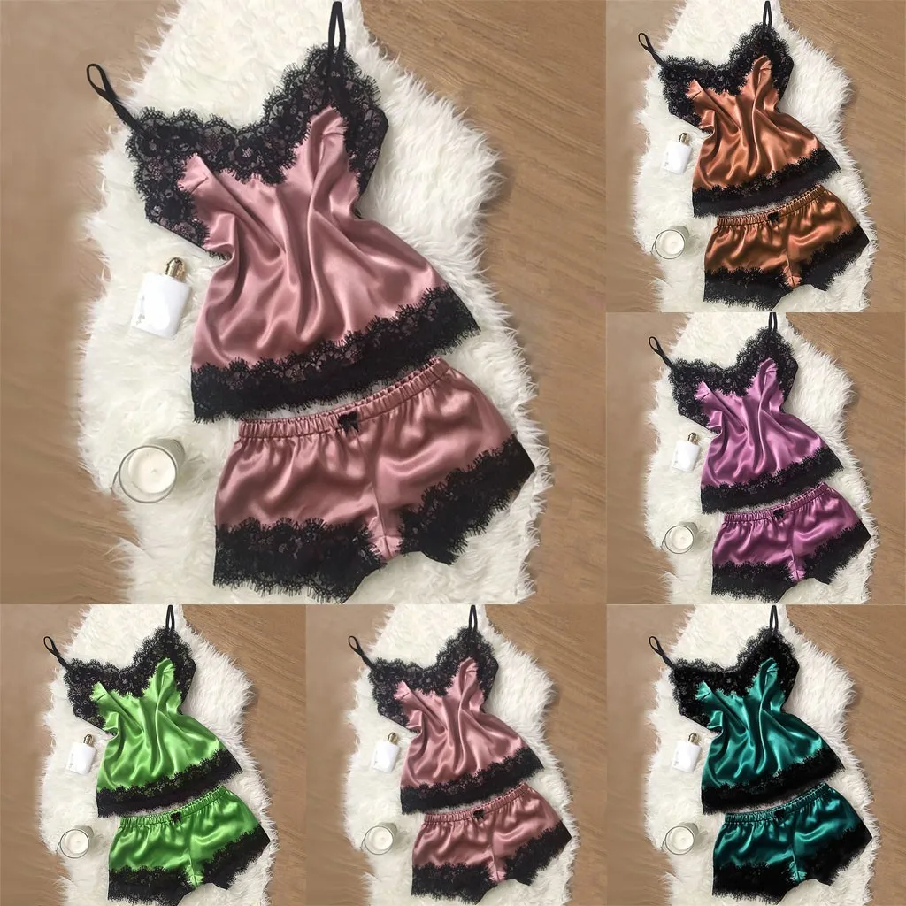 Женское кружевное ночное белье большого размера, однотонная Пижама с v-образным вырезом, бантиком и шортами на бретельках, 2019