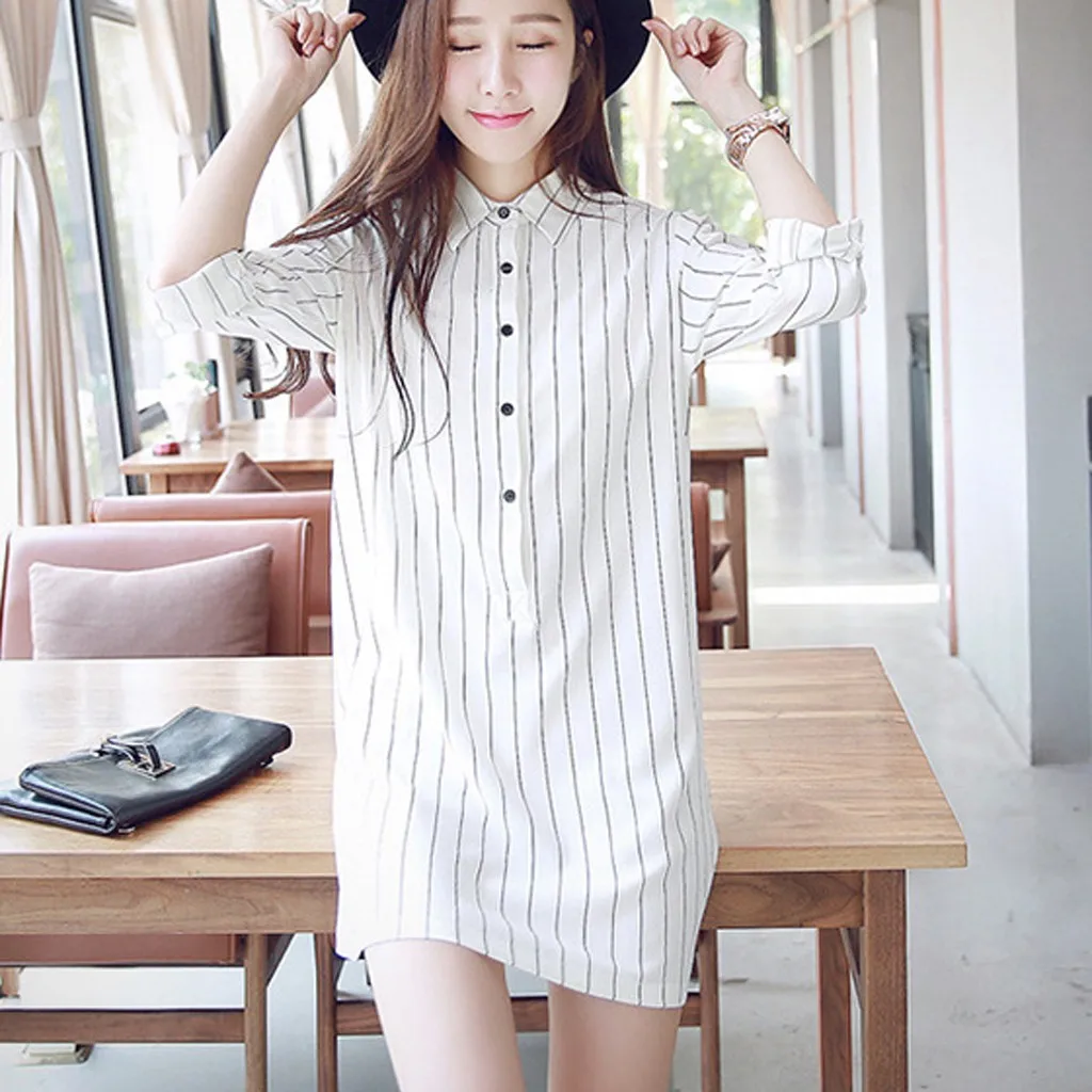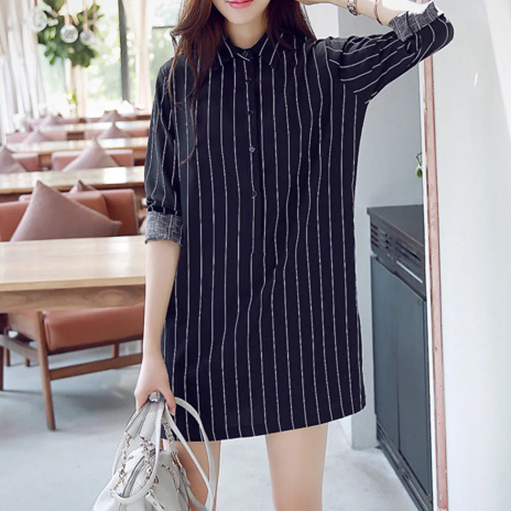 Модное женское платье-рубашка с длинным рукавом, Полосатое платье с отворотом, платье для отдыха