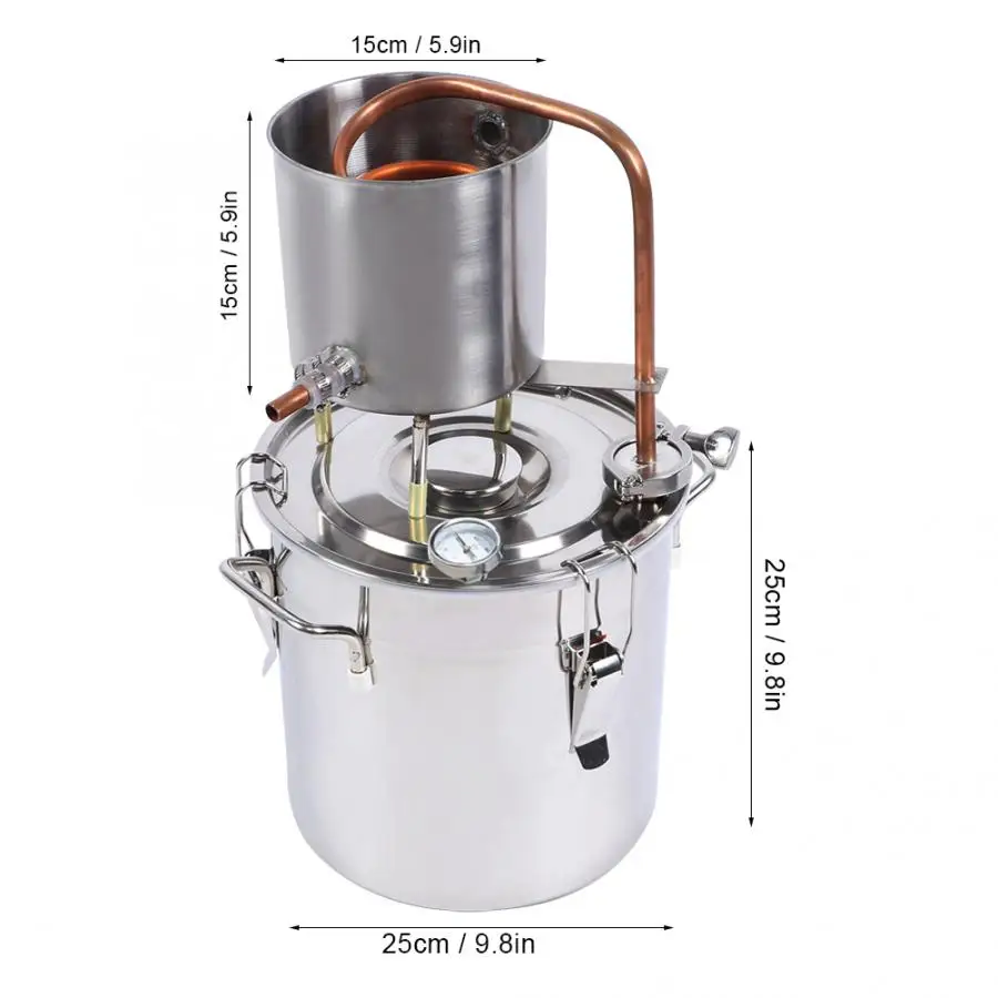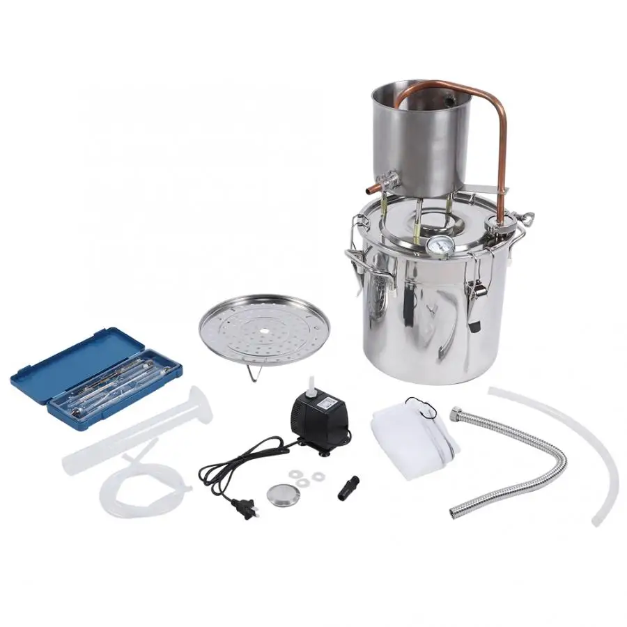 1 x ведро для дистилляции 1 х сгущенная чашка для воды 1 х спиртовой измеритель 1 мерный цилиндр 1 х фильтр Силиконовая трубка-2 шт. 1 x погружной насос 1 х фильтр-мешок 1 х Упаковка фитинга Сильфоны из нержавеющей стали, 1 шт. 1 x термометр